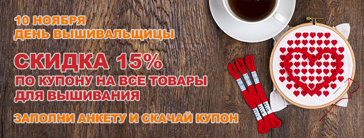 10 ноября вышивальщицы отмечают свой профессиональный праздник. Мы присоединяемся к поздравлениям и дарим в этот день скидку 15% на все товары для вышивания!