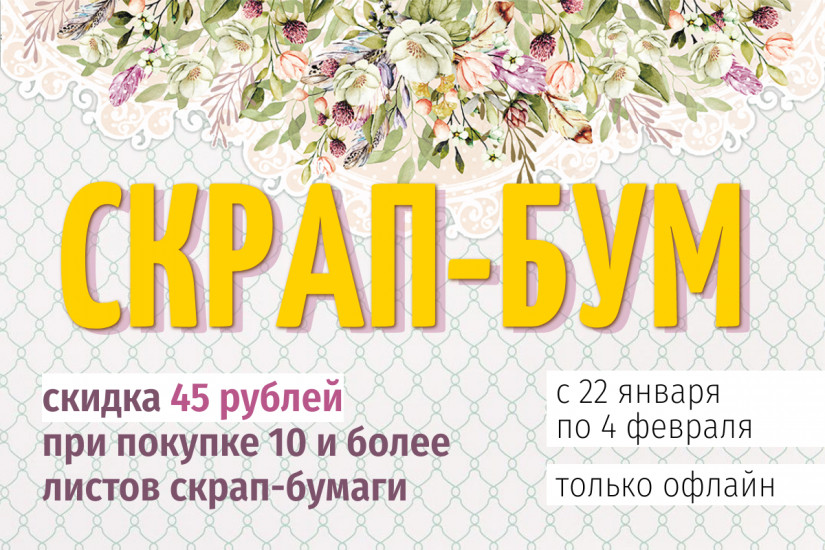 Любите создавать уникальные открытки, шкатулки и коробочки, памятные альбомы, декоративные панно и композиции? Для вас в честь Дня скрапбукинга запускаем крутую акцию: при покупке 10-ти и более листов скрап-бумаги* дарим скидку 45 рублей. Акция продлится с 22 января по 4 февраля.