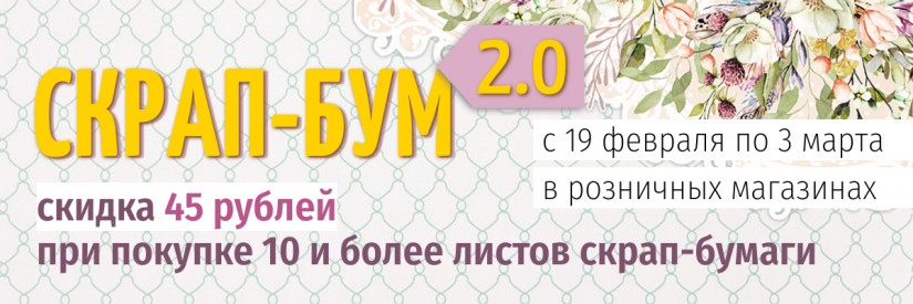Вы очень любите создавать уникальные открытки, шкатулки и коробочки, памятные альбомы, декоративные панно и композиции и очень просили нас вернуть акцию на скрап-бумагу. Мы прислушались и снова дарим вам скидку 45 рублей при покупке 10-ти и более листов скрап-бумаги.