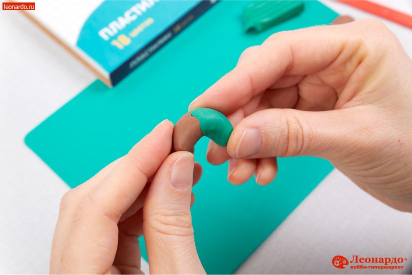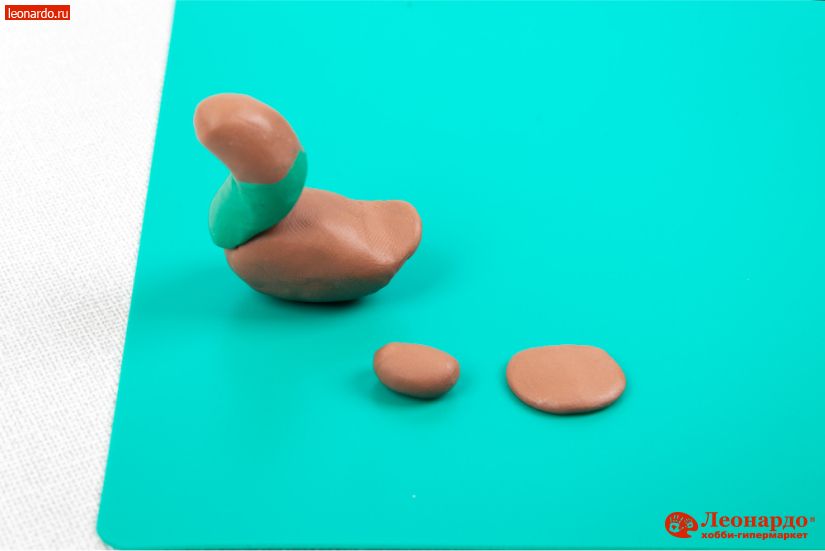 2. Чтобы сделать голову и шею, возьмите кусочки зеленого и светло-коричневого цветов, соедините их вместе и скатайте колбаску. Получится селезень.
