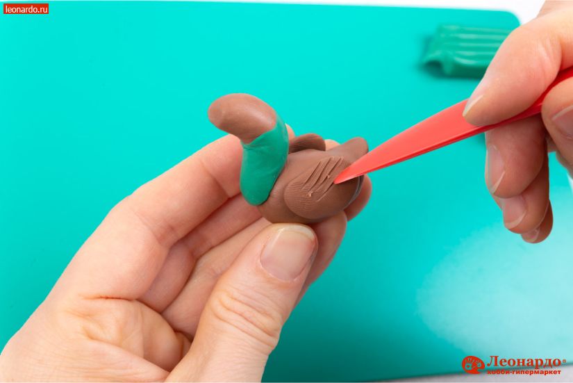 6. Прижмите крылья к бокам селезня, стекой прорисуйте перья.