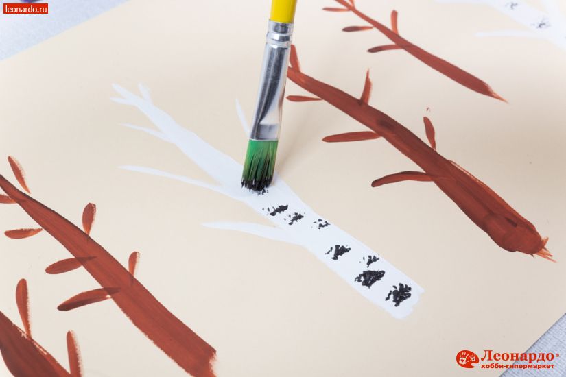5. Нарисуйте крону деревьев, нанося мазки вертикальной кистью вокруг веток, а затем и внутри.