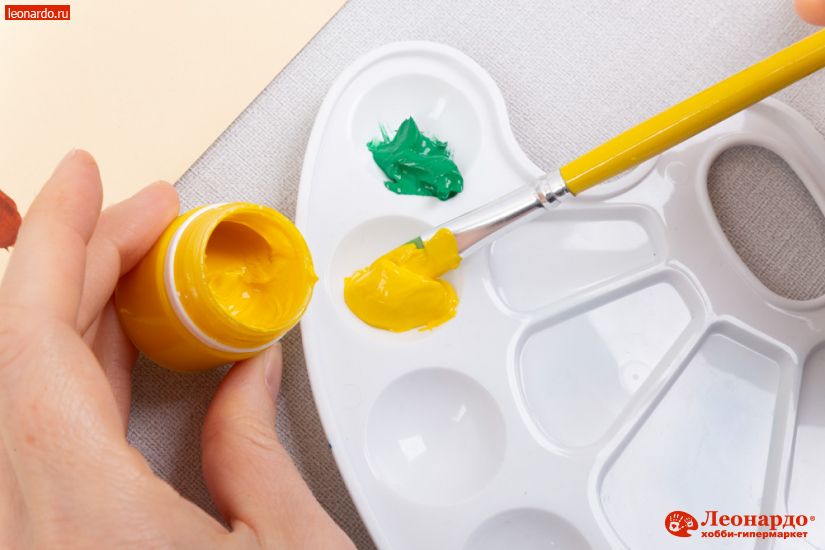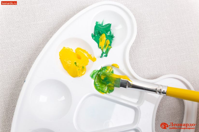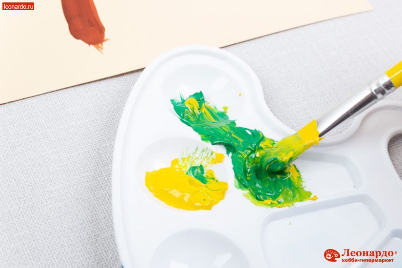 3. Можно приступать к листьям. Для этого положите на политру краску желтого и зеленого цветов.