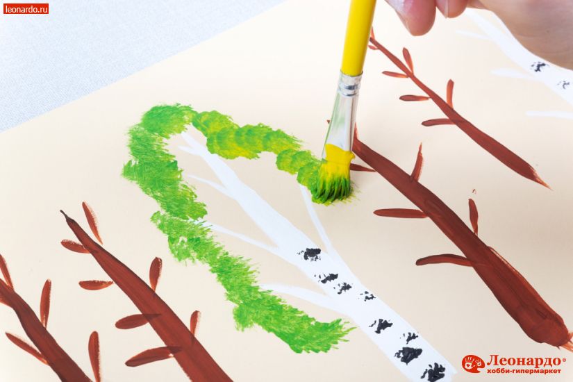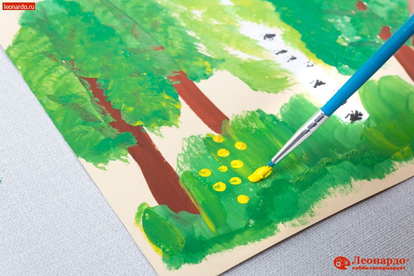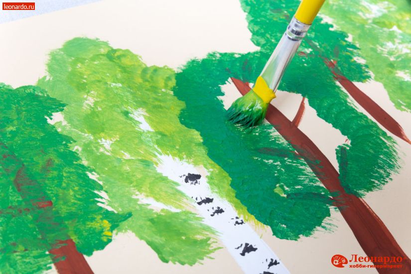 - А вот соседнее дерево я сделаю с более темной листвой. Какой краски мне надо взять больше на кисть, желтой или зеленой? Да, зеленой.