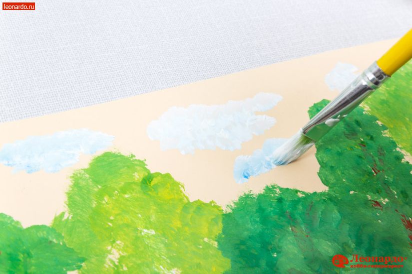 9. Смешав белую и синюю краски, можно дорисовать облака.