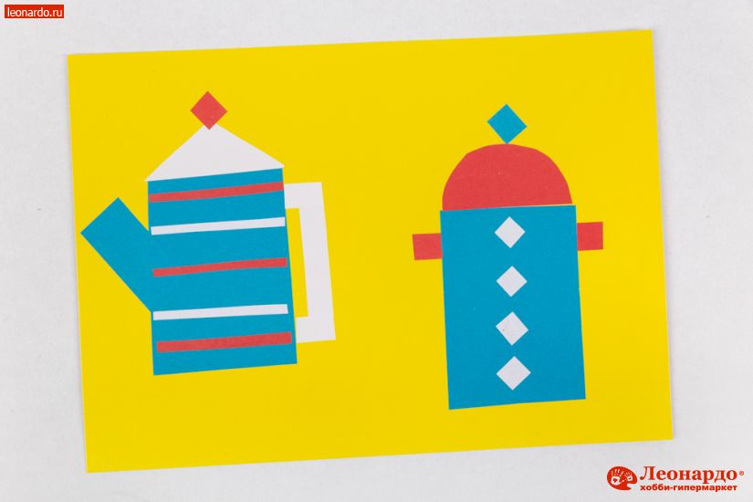 9. Нарезав цветную бумагу на полоски и квадратики, выложите орнамент на стенках чайника и кастрюли.