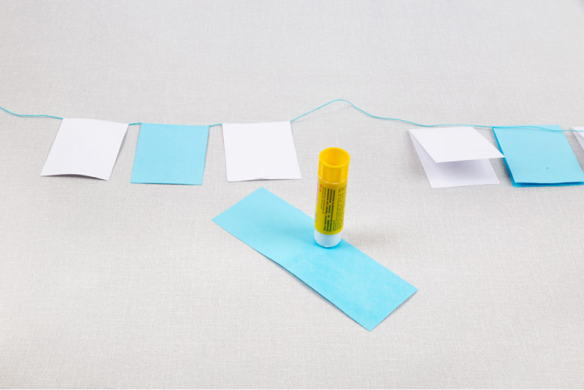6. Начните приклеивать флажки по порядку. Для этого клеем надо намазать одну внутреннюю сторону флажка и тщательно промазать линию сгиба.