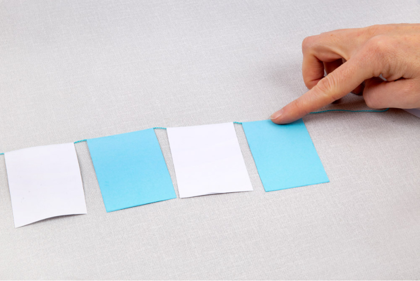 - Теперь положу перед собой длинную нить, на которой будут держаться флажки. Я раскладываю флажки, чередуя их по цвету на небольшом растоянии друг от друга.