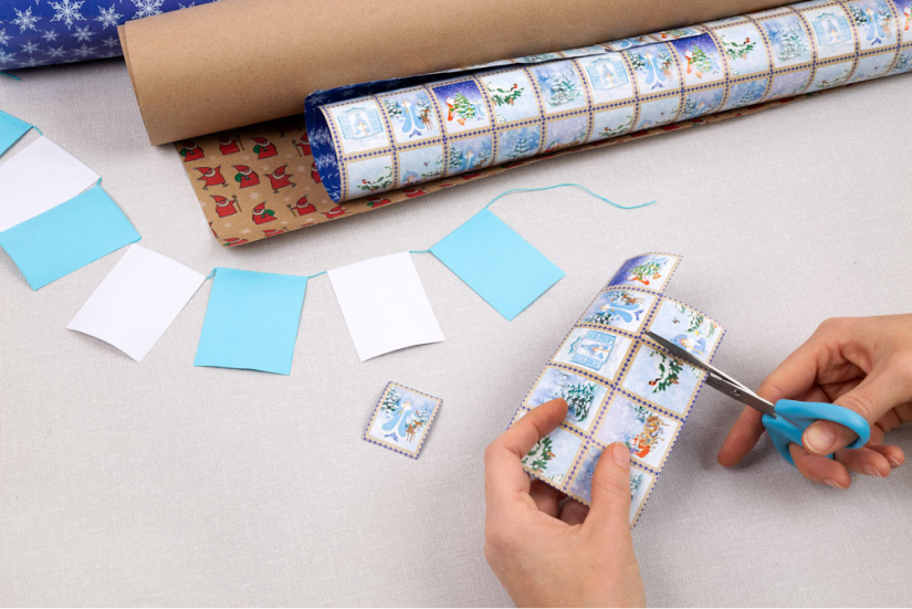 9. Для украшения флажков подберите упаковочную бумагу с новогодними картинками.