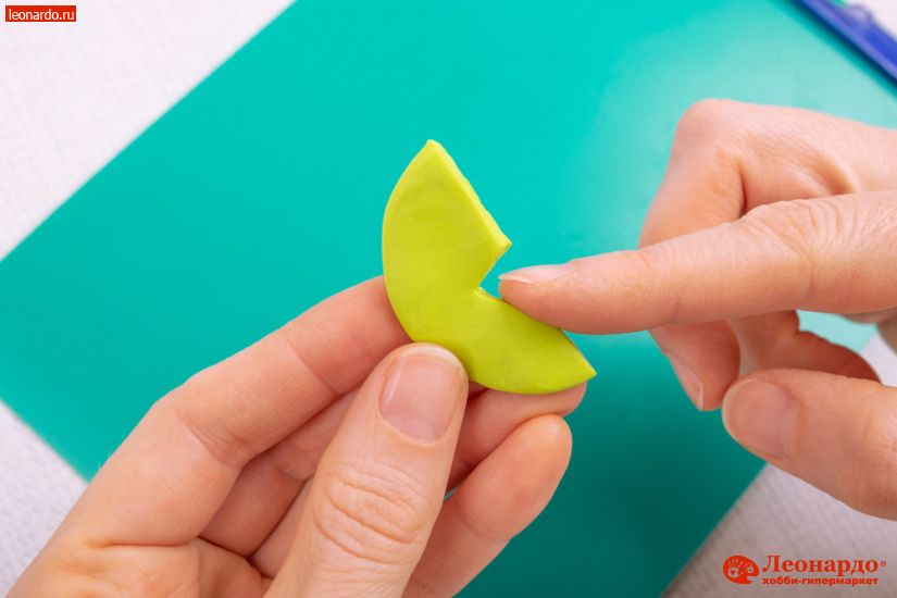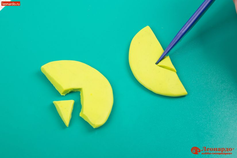 – Чтобы получить два одинаковых по размеру крыла, надо круг разделить пополам. Я кладу его на дощечку. Сначала намечаю линию, по которой буду резать. Если у меня получилось два одинаковых полукруга, режу острым концом стеки по намеченной линии. Получилось два полукруга, я меняю их местами, так, чтобы изогнутые линии были рядом, а прямые смотрели в разные стороны.