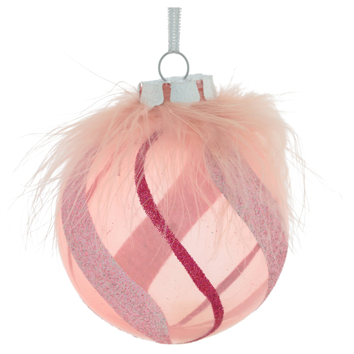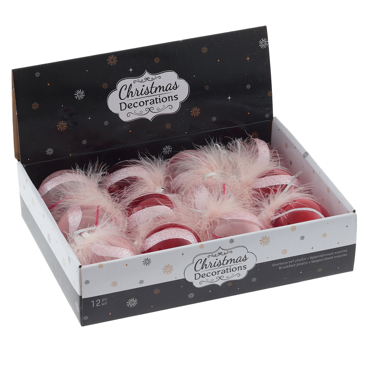 Набор шаров для елки в шоу-боксе. Эти новогодние шары красного и розового цветов с узором и нежным пером непременно порадуют вас своим изяществом и прекрасно дополнят праздничный наряд лесной красавицы.