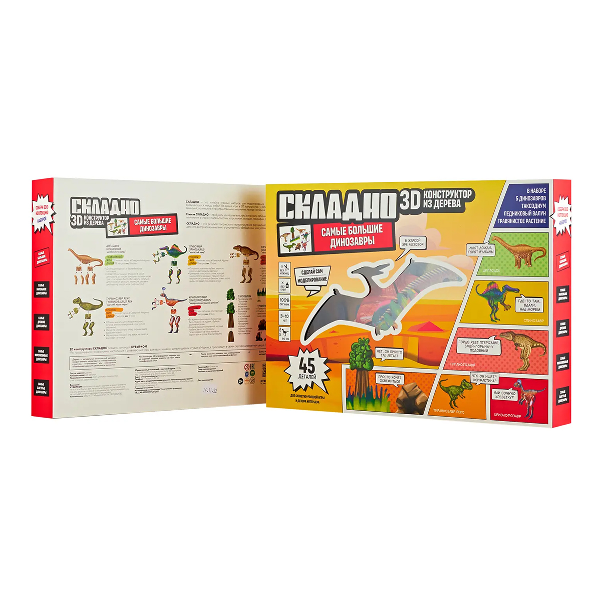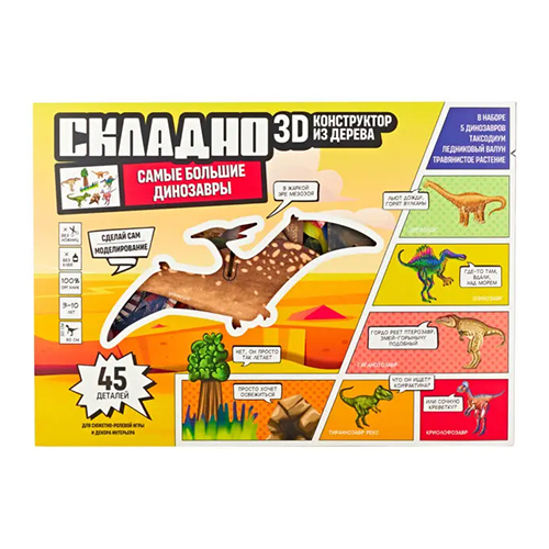 ЗD конструктор "Самые большие динозавры" состоит из 5 самых больших динозавров : Тираннозавр, Гиганотозавр, Криолофозавр, Спинозавр, Диплодок. Также набор дополнен элементами среды обитания динозавров: 1 валун , 1 дерево и 1 ряд травы для придумывания занимательных сюжетных игр. Чтобы собрать модели, не нужны ножницы или клей. Просто соберите элементы по наглядной схеме. На упаковке представлена информация о динозаврах: название, описание, интересные факты, окружающая среда. Есть инструкции по сборке. Конструктор сделан из натурального дерева и покрыт абсолютно безопасной краской .