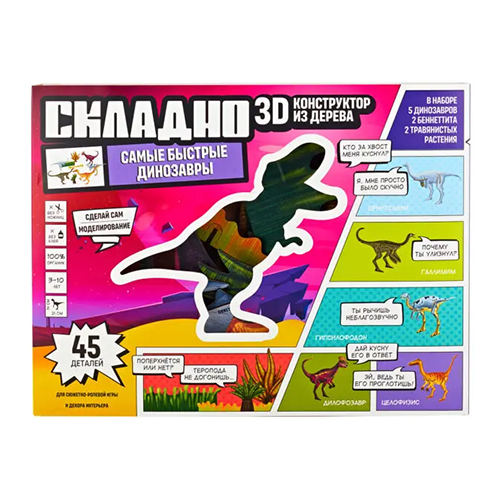 ЗD конструктор "Самые быстрые динозавры" состоит из 5 самых быстрых динозавров : Галлимим, Гипсилофодон, Орнитомим, Целофизис, Дилофозавр. Также набор дополнен элементами среды обитания динозавров: 2 куста и 2 ряда травы для придумывания занимательных сюжетных игр. Чтобы собрать модели, не нужны ножницы или клей. Просто соберите элементы по наглядной схеме. На упаковке представлена информация о динозаврах: название, описание, интересные факты, окружающая среда. Есть инструкции по сборке. Конструктор сделан из натурального дерева и покрыт абсолютно безопасной краской .