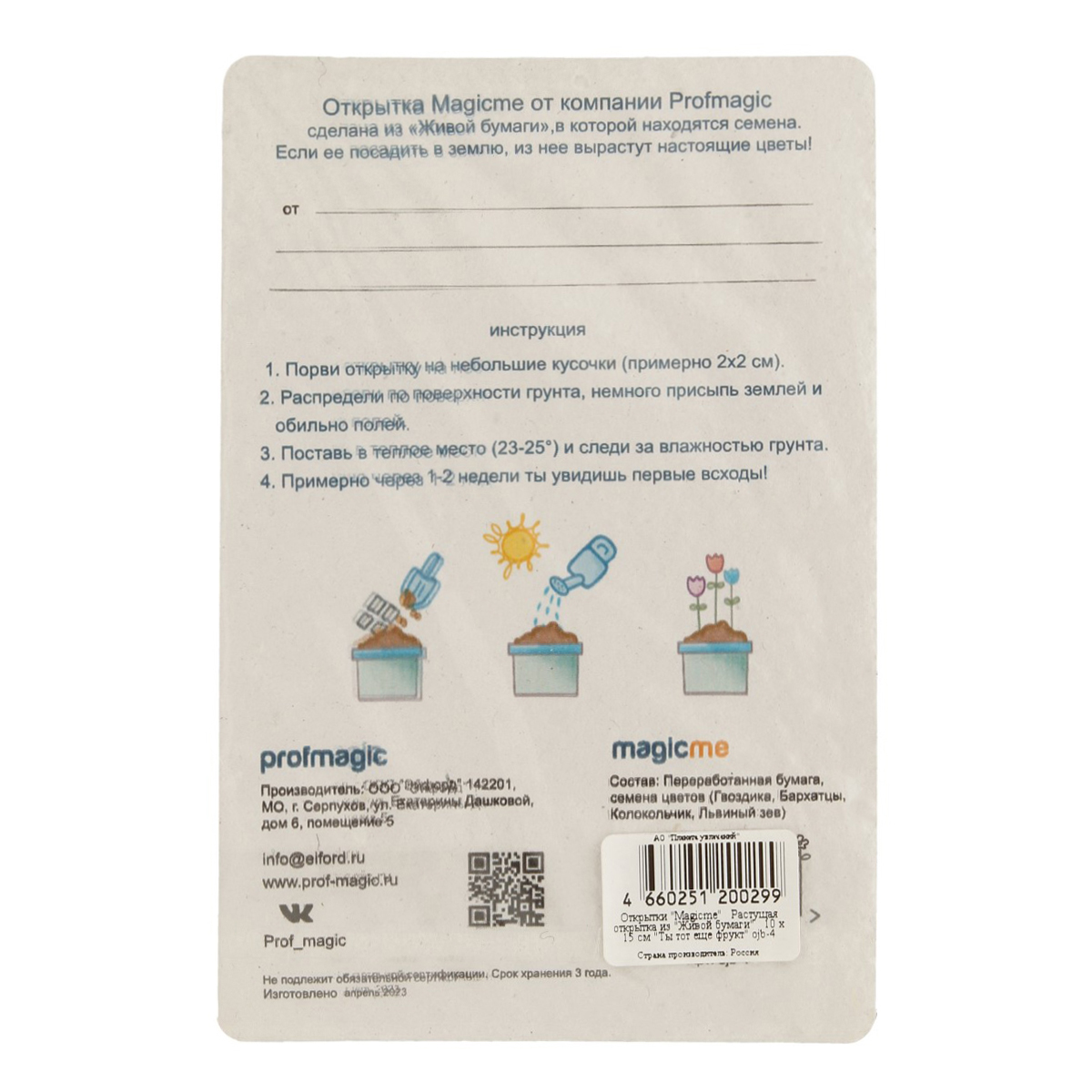 «Растущая открытка Magicme» - сделана из «живой бумаги» ручного отлива, в составе которой, находятся семена растений. Если ее посадить в землю из нее вырастут цветы [Гвоздика, Колокольчик, Ромашка].