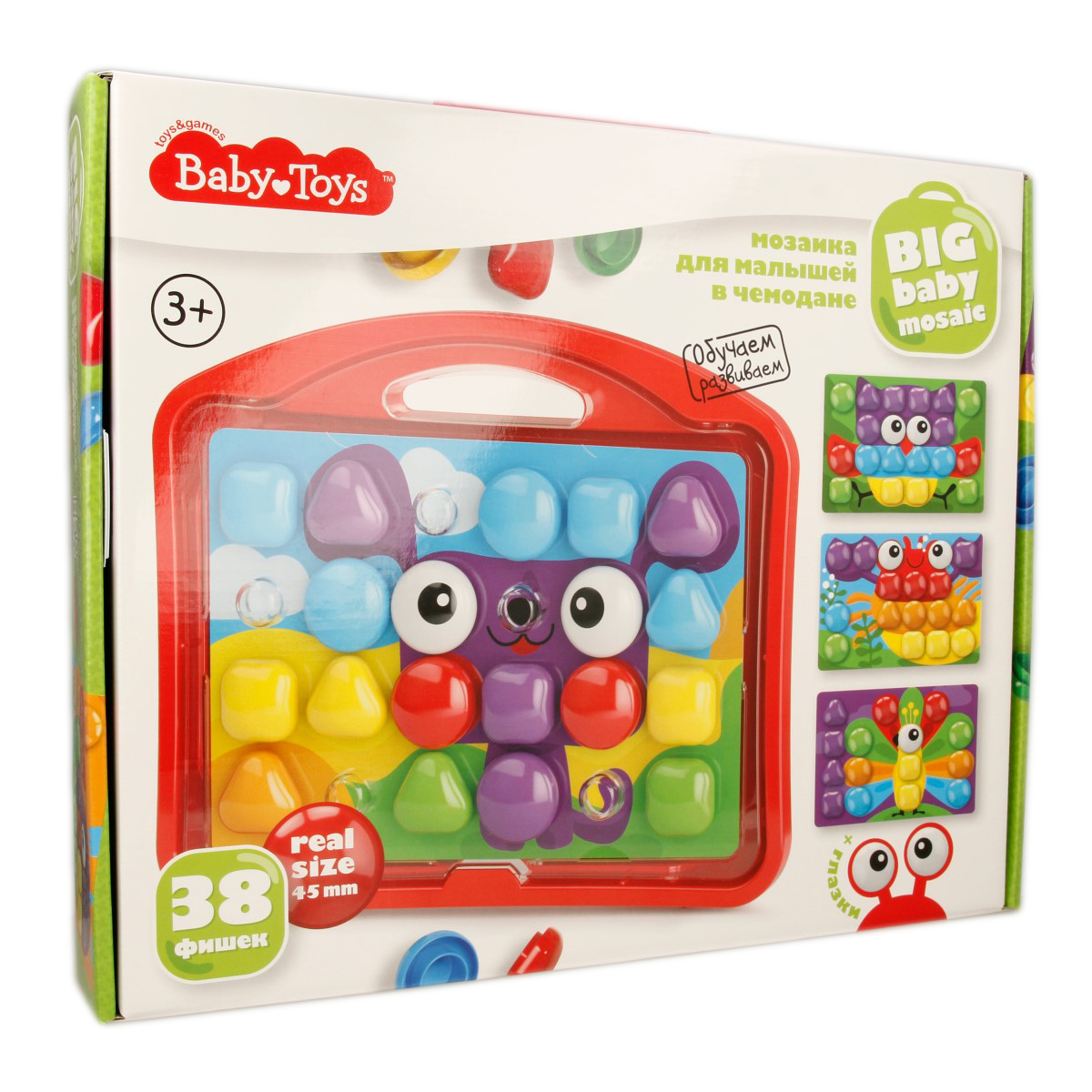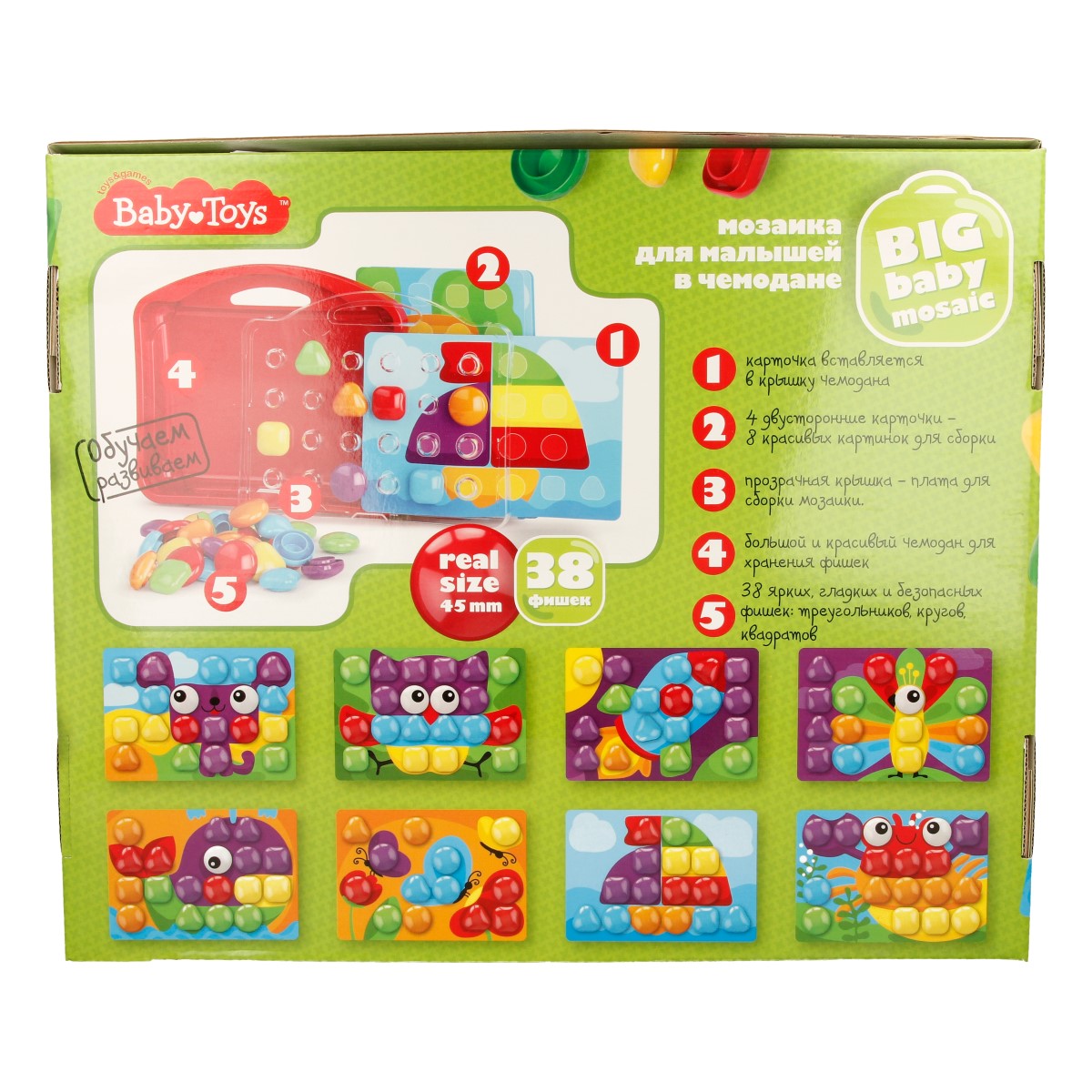 Пластиковая мозаика в чемоданчике для самых маленьких «Собачка» от Baby Toys. Состав: игровая плата в форме чемоданчика – 1 шт. [33 х 30 см], двусторонние поля с картинками – 4 шт. [30 х 21 см], пластиковые фишки – 38 шт. [4,5 см]. Формы фишек: квадрат, круг, треугольник. Цвета фишек: оранжевый, красный, голубой, жёлтый, зелёный, фиолетовый. Дополнительно: 2 глазика. Материал: пластмасса [не имеет запаха]. Сглаженная форма углов, гладкая поверхность фишек, крупный размер. На картинках обозначены подсказки для малышей. Картинки из набора: ракета, собачка, кит, парусник, бабочки, краб, сова и павлин. Игра с мозаикой развивает логику, творческие способности, мелкую моторику. Знакомит ребёнка с основными цветами и формами.