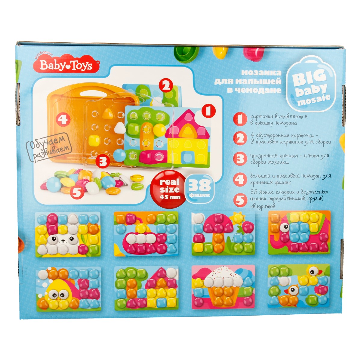 Пластиковая мозаика в чемоданчике для самых маленьких «Утята» от Baby Toys. Состав: игровая плата в форме чемоданчика – 1 шт. [33 х 30 см], двусторонние поля с картинками – 4 шт. [30 х 21 см], пластиковые фишки – 38 шт. [4,5 см]. Формы фишек: квадрат, круг, треугольник. Цвета фишек: оранжевый, розовый, голубой, жёлтый, зелёный, белый. Дополнительно: 2 глазика. Материал: пластмасса [не имеет запаха]. Сглаженная форма углов, гладкая поверхность фишек, крупный размер. На картинках обозначены подсказки для малышей. Картинки из набора: зайчик, подводная лодка, гриб, слоник, рыбка, домик, пирожное и утята. Игра с мозаикой развивает логику, творческие способности, мелкую моторику. Знакомит ребёнка с основными цветами и формами.