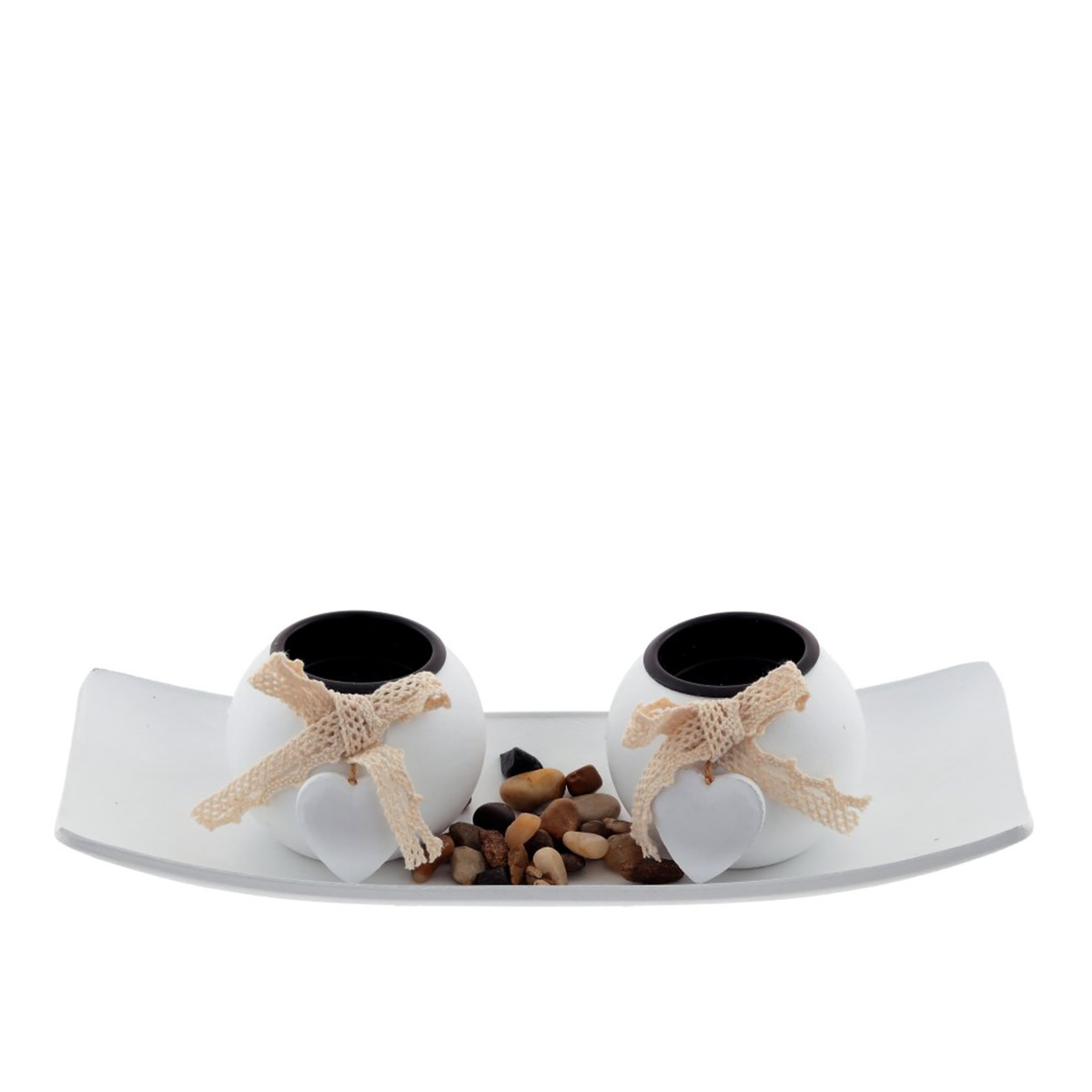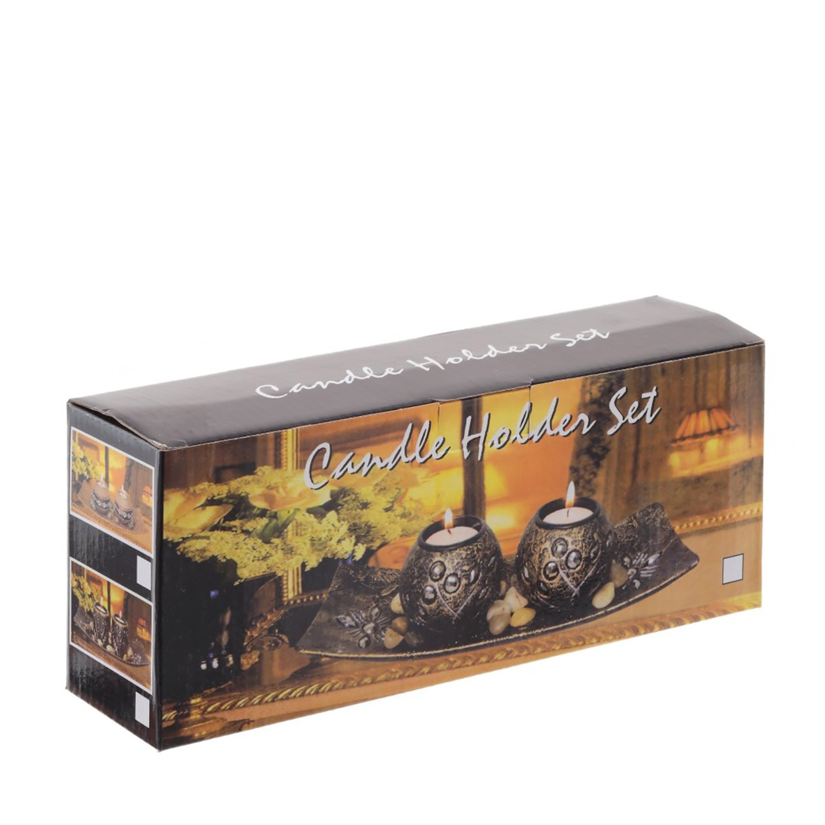 Подсвечник стильный и современный. Изделие состоит из двух подсвечников для свечей диаметром 3,5 см, подносика и декоративных камней. Декоративные подсвечники способны добавить стиля вашему дому, вписаться в любой интерьер, наполняя его гармонией и уютом.