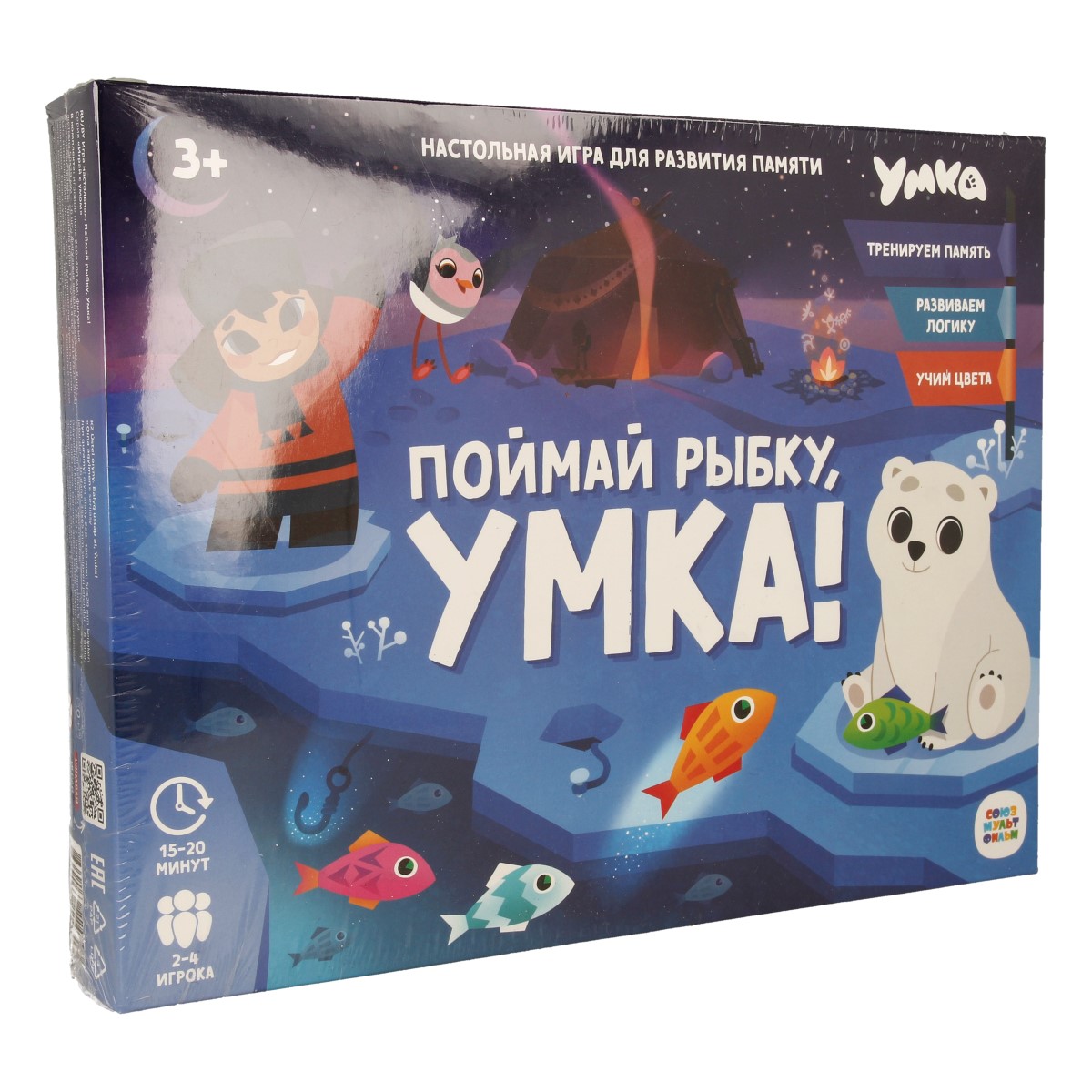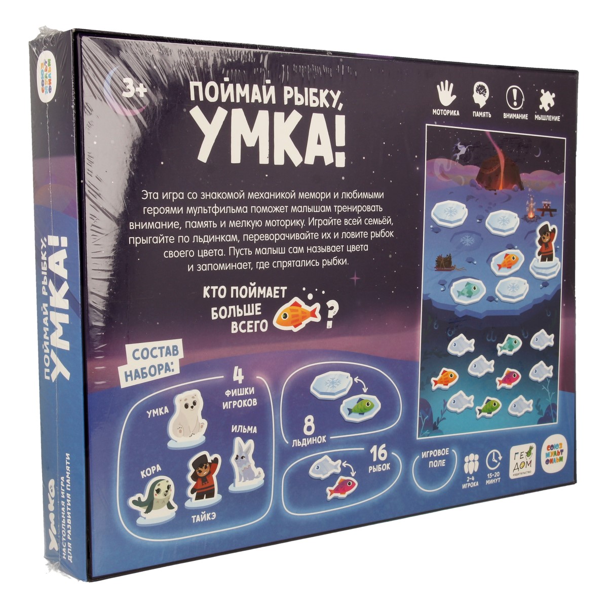 «Поймай рыбку, Умка» – это настольная игра для развития памяти со знакомой механикой мемори и любимыми персонажами! Сможешь отыскать всех рыбок, которые спрятались подо льдом? Скорее отправляйся на рыбалку вместе с Умкой и его друзьями! Играйте всей семьёй и тренируйте память, внимание и мелкую моторику малыша. Прыгайте по льдинкам, ловите рыбок, запоминайте цвета и веселитесь вместе с героями любимого мультфильма! Рекомендованный возраст: 3+.