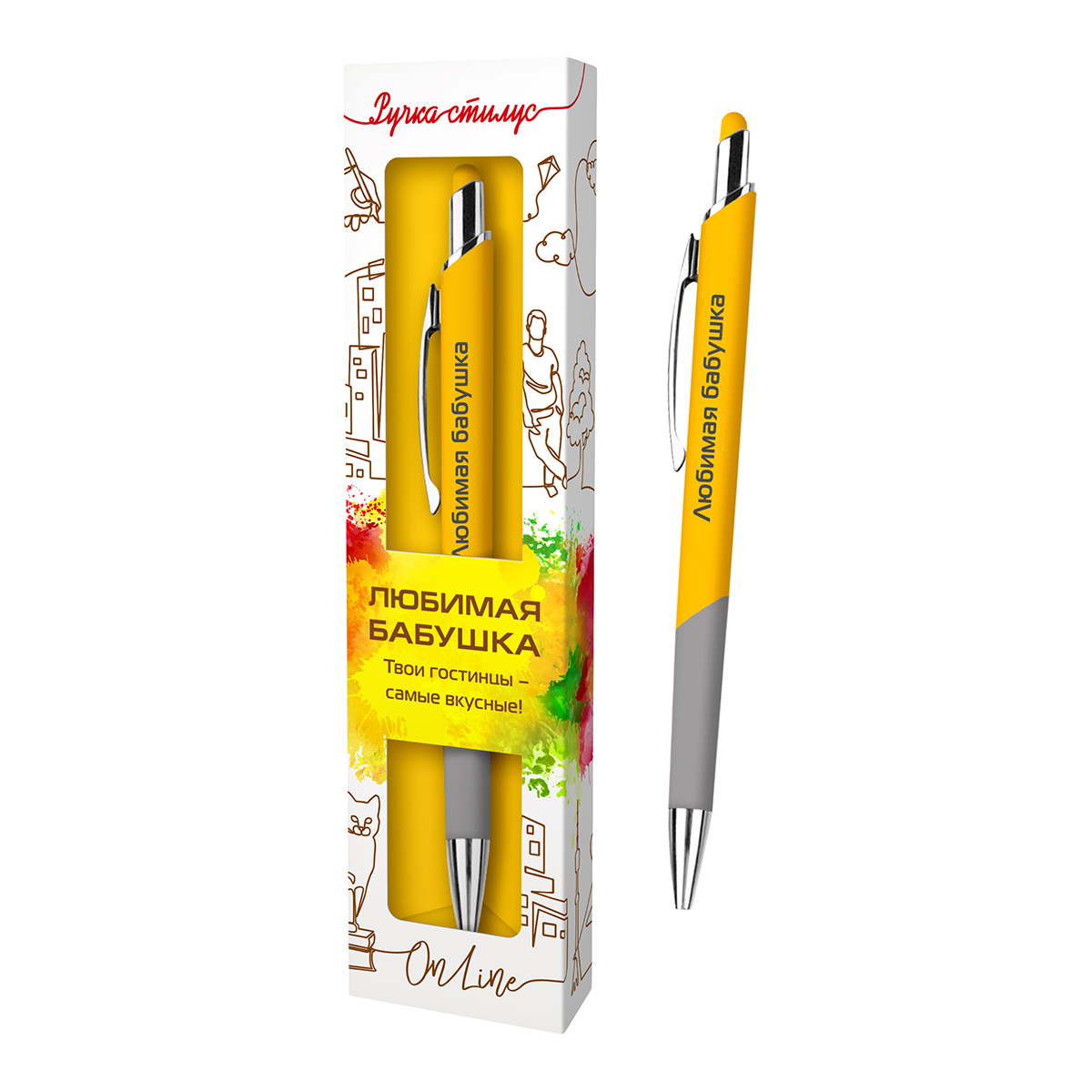 Ручка со стилусом именная OnLine "Любимая бабушка" в подарочной коробке. Красивые именные ручки четырех актуальных цветов, каждая - в своей подарочной упаковке. Ручка выполнена из алюминия, покрыта специальным soft-touch слоем для большего комфорта при использовании. Ручка с нажимным механизмом, стержень шариковый, тип PARKER, 98 мм , цвет чернил - синий. На ручке имеется стилус для работы с мобильными гаджетами. Подарочная коробочка произведена из дизайнерского картона по новейшим полиграфическим технологиям. Выделяющийся подарок для Ваших близких, коллег, партнеров по бизнесу. На каждой коробочке - индивидуальные мотивирующие слова. На корпусе ручки нанесение имени или универсальной надписи. Вечная классика в современном дизайнерском решении.