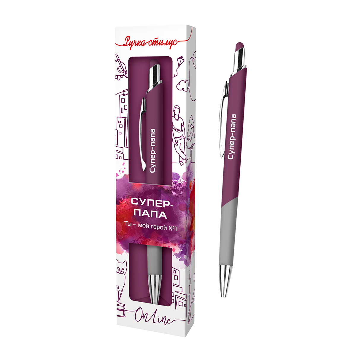 Ручка со стилусом именная OnLine "Супер-папа" в подарочной коробке. Красивые именные ручки четырех актуальных цветов, каждая - в своей подарочной упаковке. Ручка выполнена из алюминия, покрыта специальным soft-touch слоем для большего комфорта при использовании. Ручка с нажимным механизмом, стержень шариковый, тип PARKER, 98 мм , цвет чернил - синий. На ручке имеется стилус для работы с мобильными гаджетами. Подарочная коробочка произведена из дизайнерского картона по новейшим полиграфическим технологиям. Выделяющийся подарок для Ваших близких, коллег, партнеров по бизнесу. На каждой коробочке - индивидуальные мотивирующие слова. На корпусе ручки нанесение имени или универсальной надписи. Вечная классика в современном дизайнерском решении.