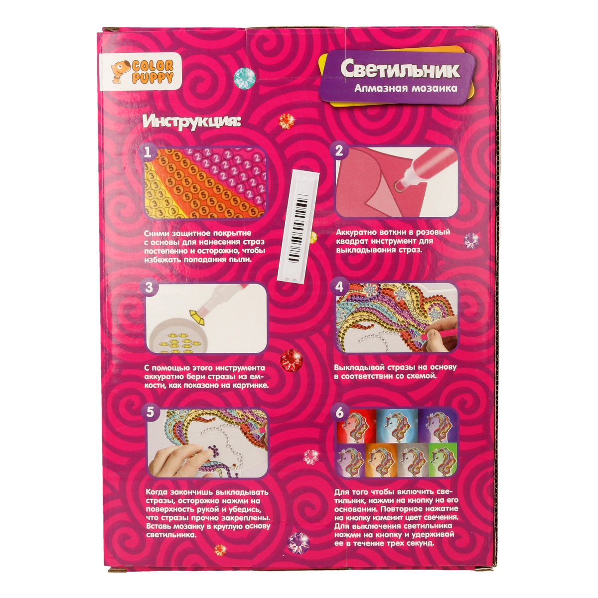 Набор с алмазной мозаикой «Единорог» от ТМ Color Puppy предназначен для декорирования уникального светильника. В нём предусмотрено целых 7 цветовых режимов свечения, эффектность которого будут подчёркивать роскошные сверкающие стразы! В комплект входят: алмазная мозаика-светильник, инструмент для наклеивания страз, ёмкость для страз, стразы. Как декорировать светильник: 1. Прозрачное защитное покрытие нужно снимать постепенно, выкладывая стразы только на определённые участки основы. Это предотвратит попадание пыли. 2. Инструмент для выкладывания страз следует аккуратно воткнуть в розовый квадрат. Далее с помощью этого инструмента можно извлекать стразы из ёмкости. 3. Стразы необходимо выкладывать на основу в соответствии со схемой. 4. По окончании работы со стразами нужно убедиться, что они надёжно закреплены, нажав на поверхность ладонью. 5. Готовую мозаику можно вставлять в круглую основу! Светильник включается нажатием кнопки на его основании. Повторное нажатие кнопки меняет цвет свечения. Светильник работает от 3-х батареек типа АА на 1,5 V . Изготовлено из полимерных материалов. Рекомендованный возраст: 3 года +