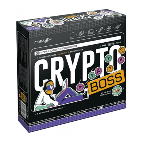Самая актуальная новинка в категории игр «про деньги»! Модный дизайн, крутая механика, яркие персонажи – и море азарта! Вас ждёт торговля на бирже, майнинг криптовалюты, аукционы – и многое другое! Каждая клетка на поле может оказаться решающей – бросай кубик и используй максимум возможностей, чтобы стать лучшим игроком в криптомире. Количество игроков: 2–6. Рекомендованный возраст: 14+