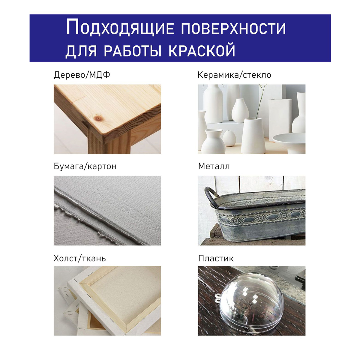 Краски «Акрил-Хобби» — это яркая палитра матовых красок и несколько оттенков «металлик». Краски разбавляются водой, мягкие и кроющие по консистенции. После высыхания не растворимы. Не содержат вредных веществ и пигментов с тяжелыми металлами.