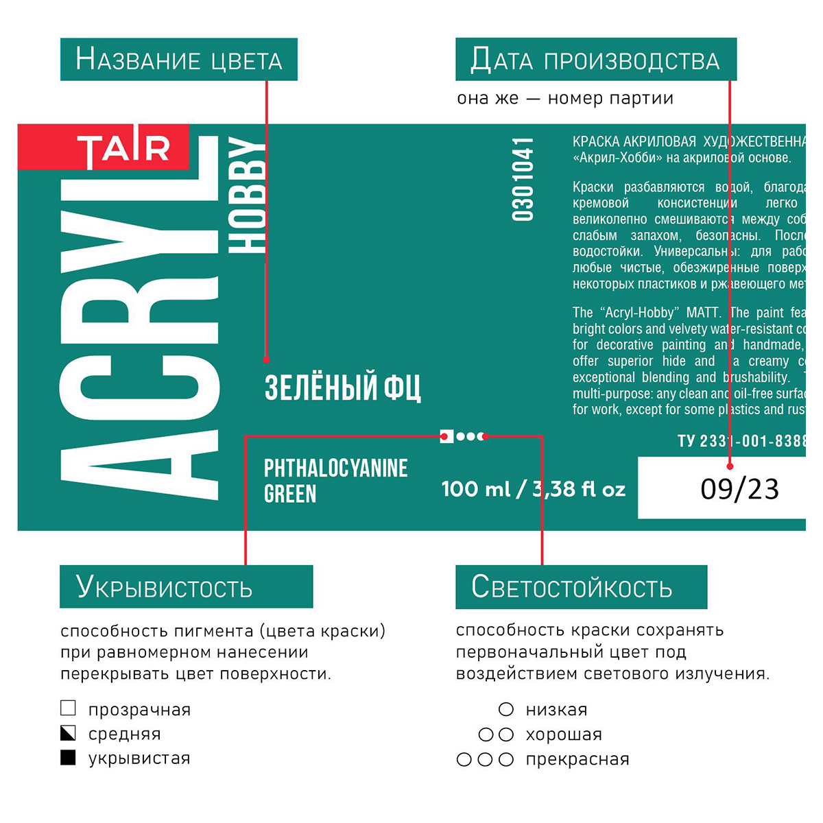 Краска акриловая ТАИР матовые Акрил-Хобби 100 мл 0301041 Зеленый ФЦ Фото 6.