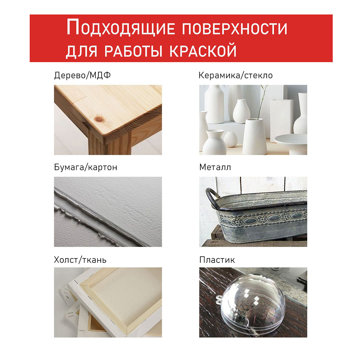 Краски «Акрил-Хобби» — это яркая палитра матовых красок и несколько оттенков «металлик». Краски разбавляются водой, мягкие и кроющие по консистенции. После высыхания не растворимы. Не содержат вредных веществ и пигментов с тяжелыми металлами.