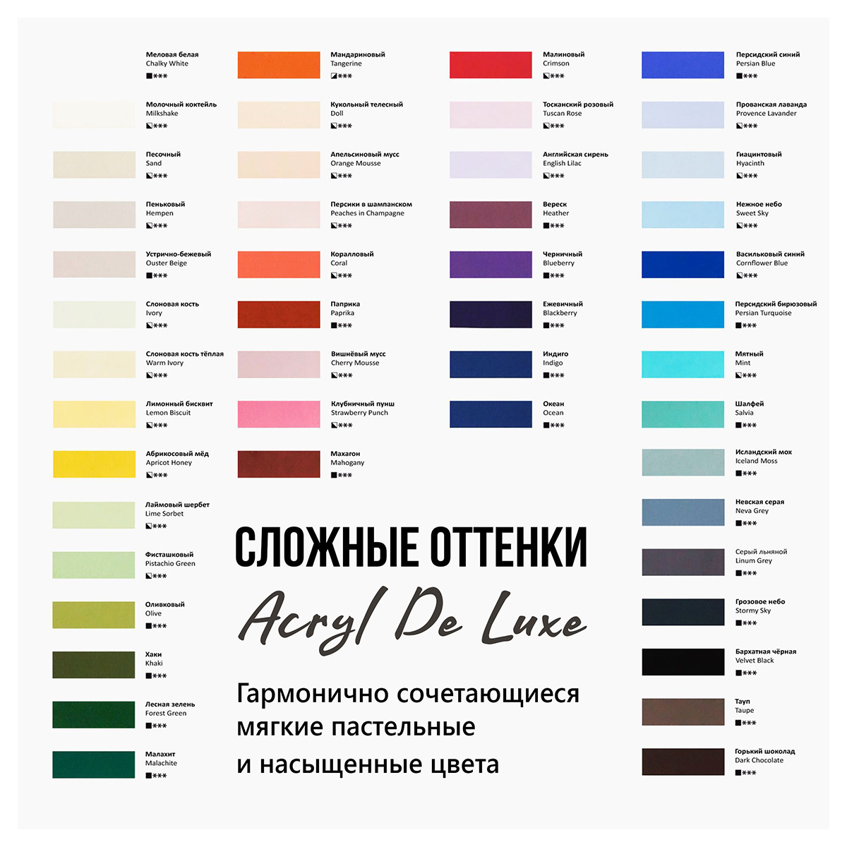 Акриловая краска для рисования "Акрил Де Люкс". Эта линейка акриловых красок обладает кремовой консистенцией и потрясающим матовым финишем. Благодаря этому свойству краски напоминают по своим характеристикам меловые. Краска акриловая для живописи "Акрил Де Люкс" подходит для декоративных работ по дереву, грунтованному металлу, пластику, стеклу, керамике, ткани [холст хлопковый и льняной] и др. Хорошая сцепляемость практически со всеми свободными от жира подложками. Также, при правильной подготовке поверхности, используется как краска для мебели. Краска акриловая Таир "Де Люкс" имеет высокий уровень светостойкости, а время её высыхания не более часа. Художественные акриловые краски "Де Люкс" можно разбавлять водой, акриловым лаком, разбавителем акриловых красок