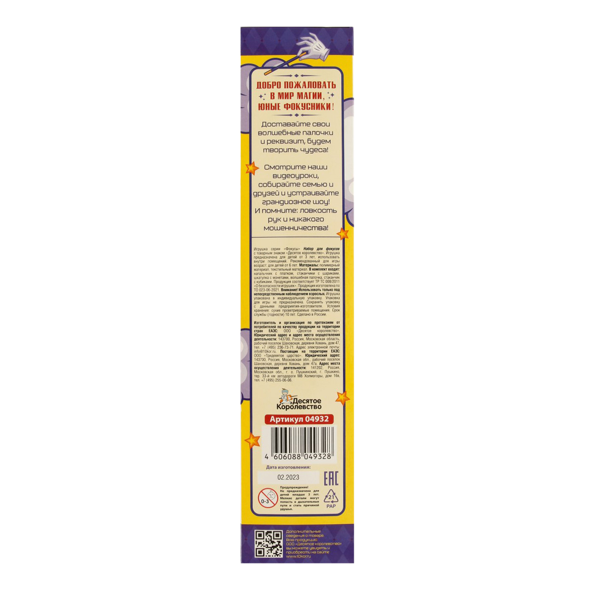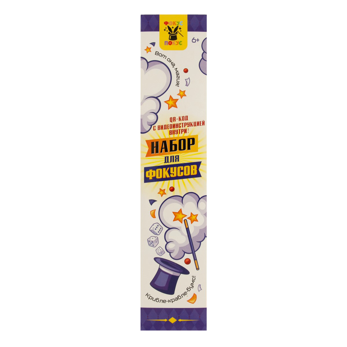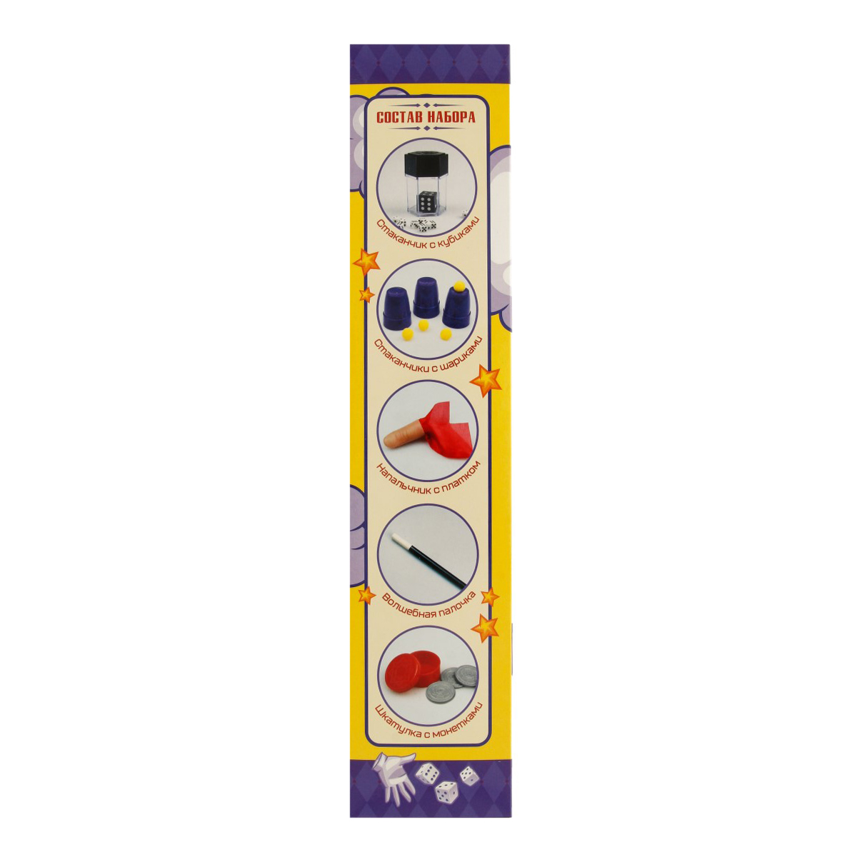 "Набор для фокусов. Состав игры: - 1 волшебная палочка - длина 33 см, - стаканчик - высота 7,5 см, - 8 кубиков - 0,8х0,8х0,8 см - напальчник с платком - длина напальчника 5,5 см - 3 стакана - высота 5 см - 4 шарика - диаметр 1,5 см - коробочка - диаметр 3 см - 3 монетки - диаметр 2,5 см. Материалы: текстиль, картон, полимерные материалы. Для детей старше 6 лет"
