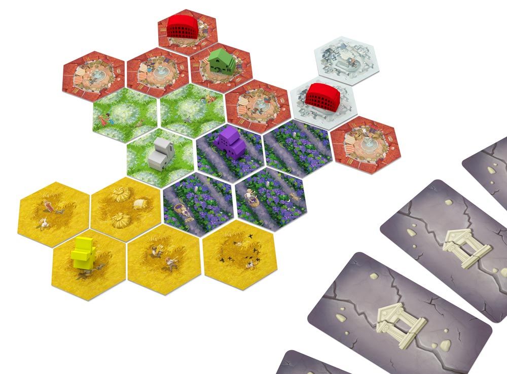 Много взаимодействия между игроками. Захватывающая стратегия с короткими партиями. Необычная механика игры. Игра - победитель КОРНИ 9. В состав игры Новые римляне входит: 100 участков земель ; 40 фишек построек ; 20 кристаллов; 10 карт выбора ; 5 карт построек; 5 двусторонних карт-памяток; 5 ширм; 1 блокнот для подсчёта победных очков, правила игры.