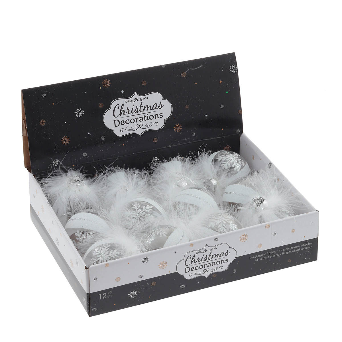 Набор из 12-ти шаров для елки в шоу-боксе. Эти новогодние шары из пластика с изящным узором и перьями , непременно порадуют вас своим изяществом и прекрасно дополнят праздничный наряд лесной красавицы.