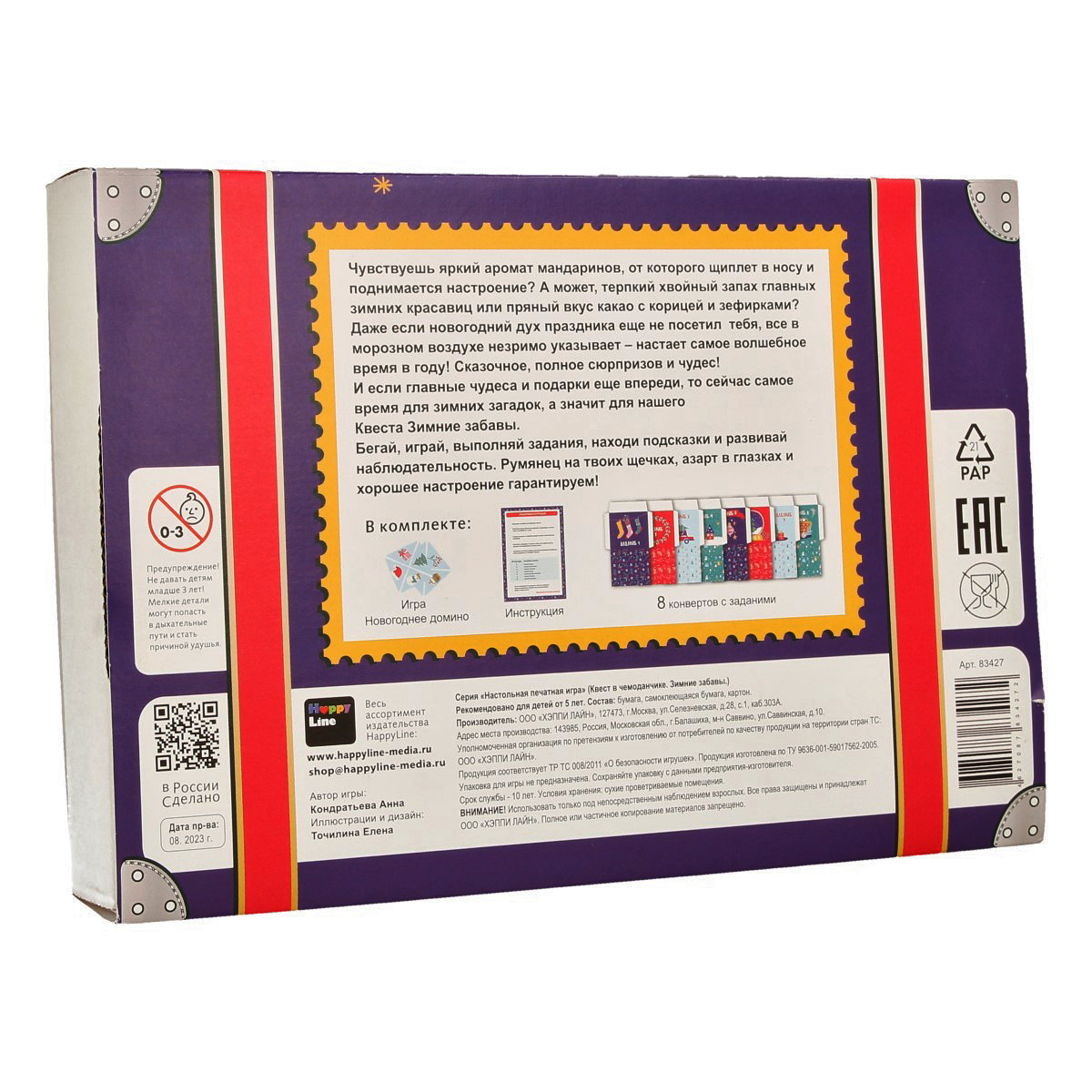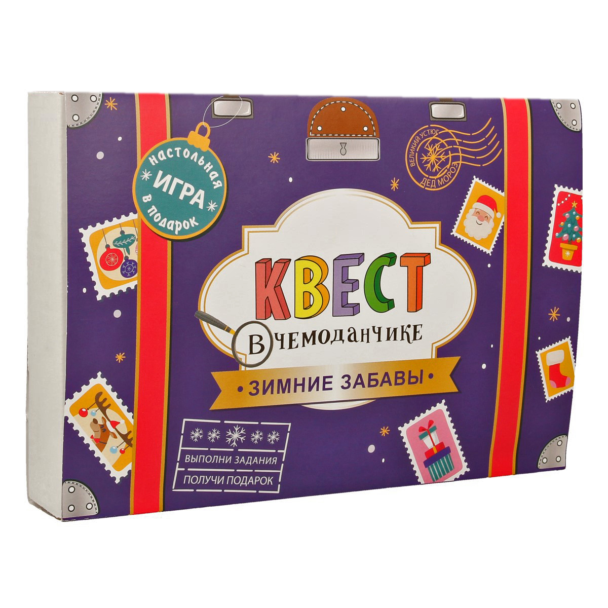 Набор "Квест в чемоданчике. Зимние забавы" с подарком. В комплекте: - инструкция - 8 конвертов с заданиями - буклет для наклеек - наклейки - настольная игра. Это не просто набор заданий с ребусами и загадками, а поэтапный квест с поиском подарка.