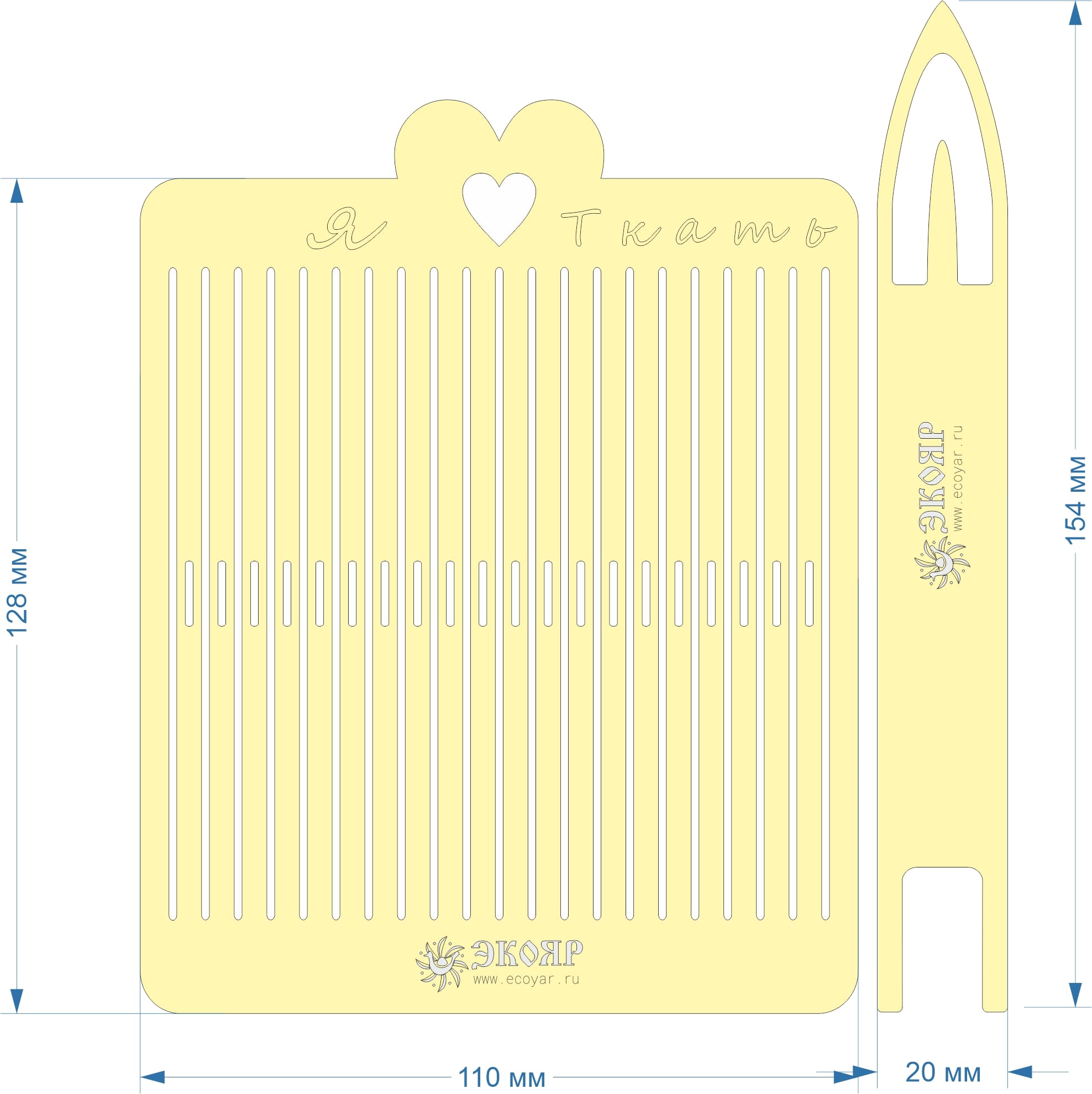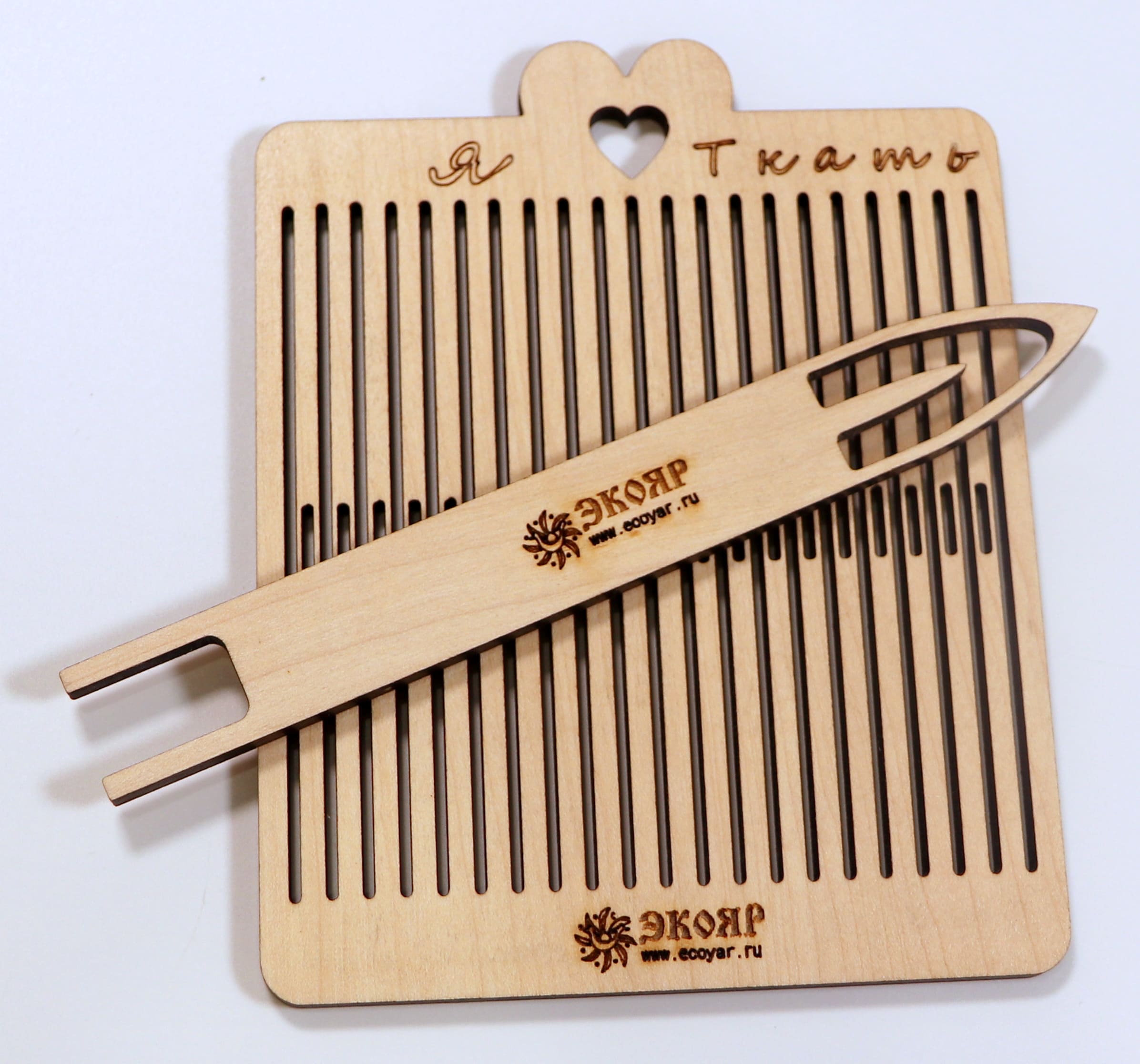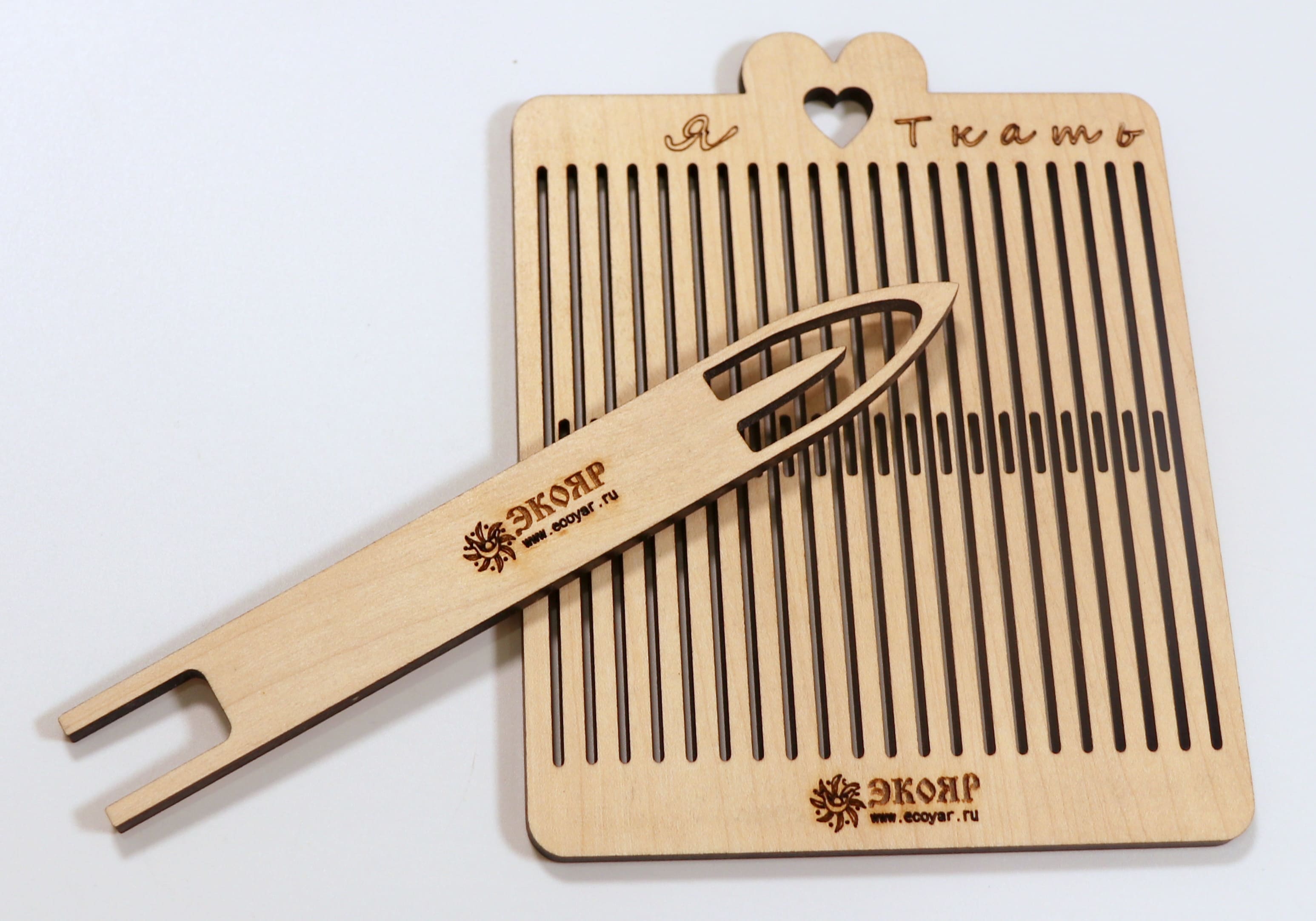Инструмент для тканья поясов и тесьмы в определенной технике. Характеристики бердышка: размер - 110х140х3 мм Рабочая ширина - 100 мм.; Плотность 40 ; Высота зубьев - 100 мм.; Глазки 1,2х10 мм; Характеристики челночка: размер - 155х20х3 мм Материал: экофанера 3 мм.