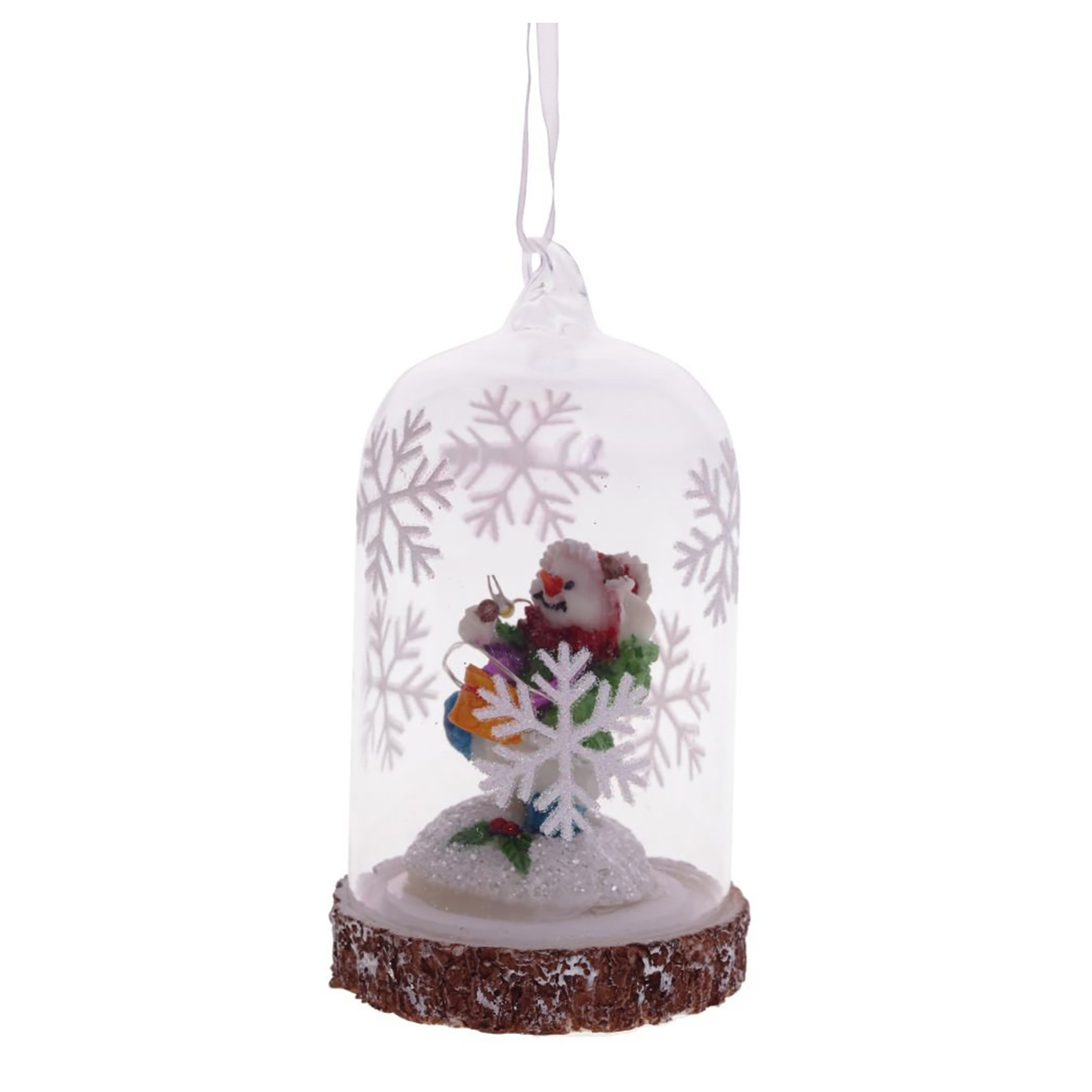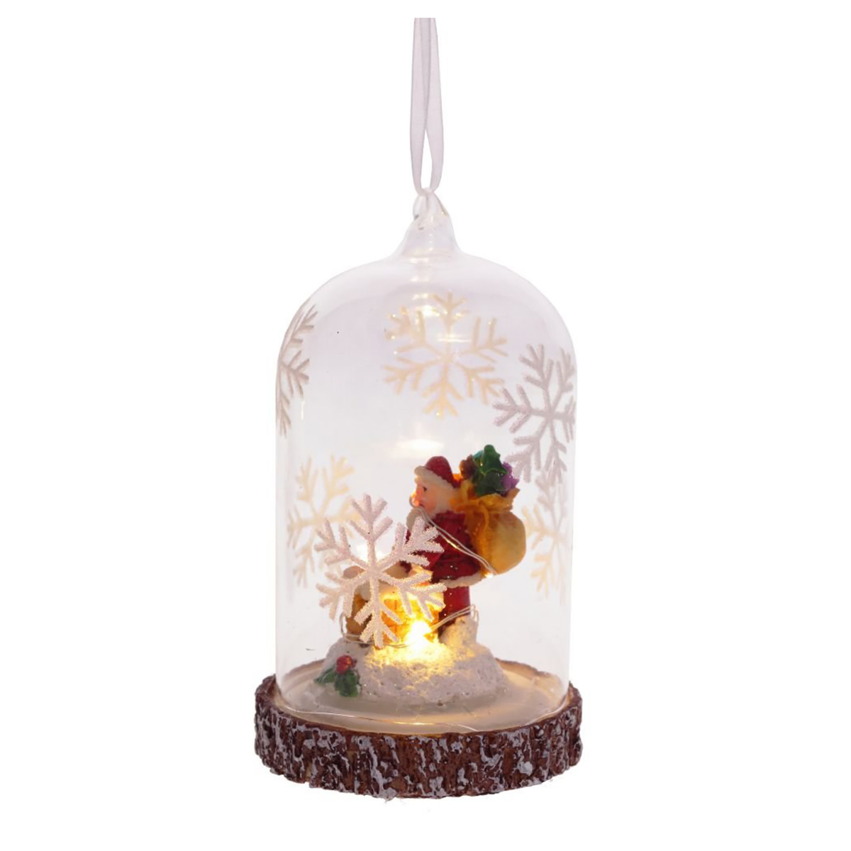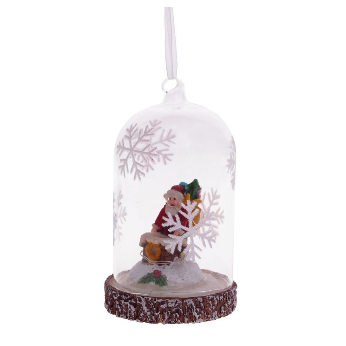 Елочное украшение в виде прозрачного колокола с фигурками новогодних персонажей внутри. Отлично подойдет для декорации вашего дома и новогодней ели. С помощью специальной петельки игрушку можно подвесить. Такое украшение создаст в вашем доме атмосферу праздника, веселья и радости. Представлена в двух вариантах.