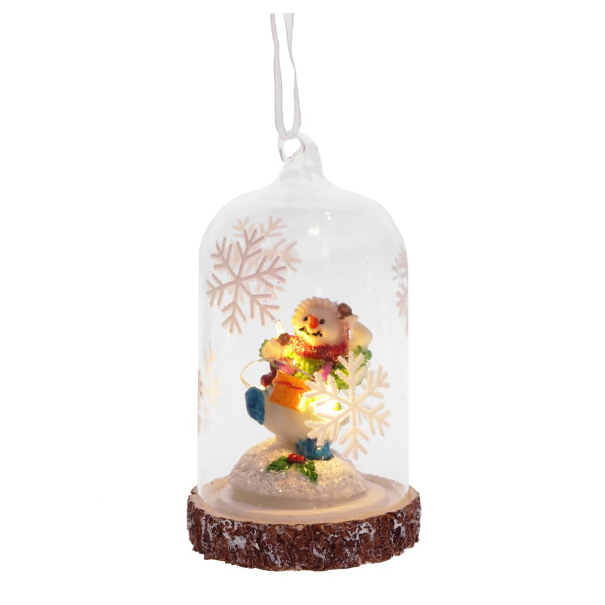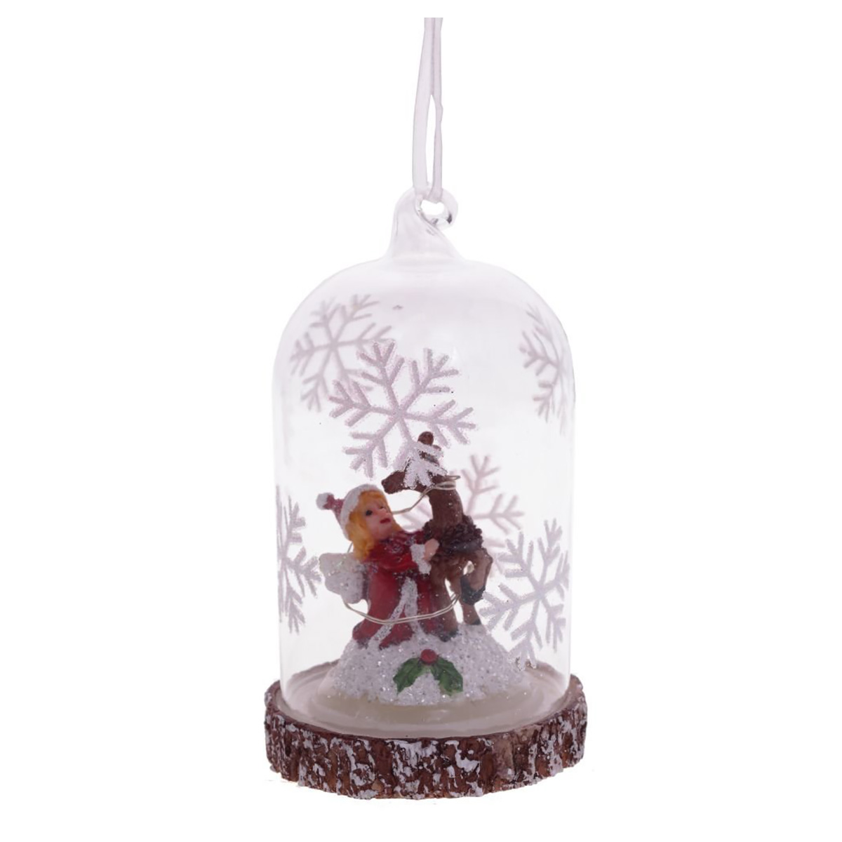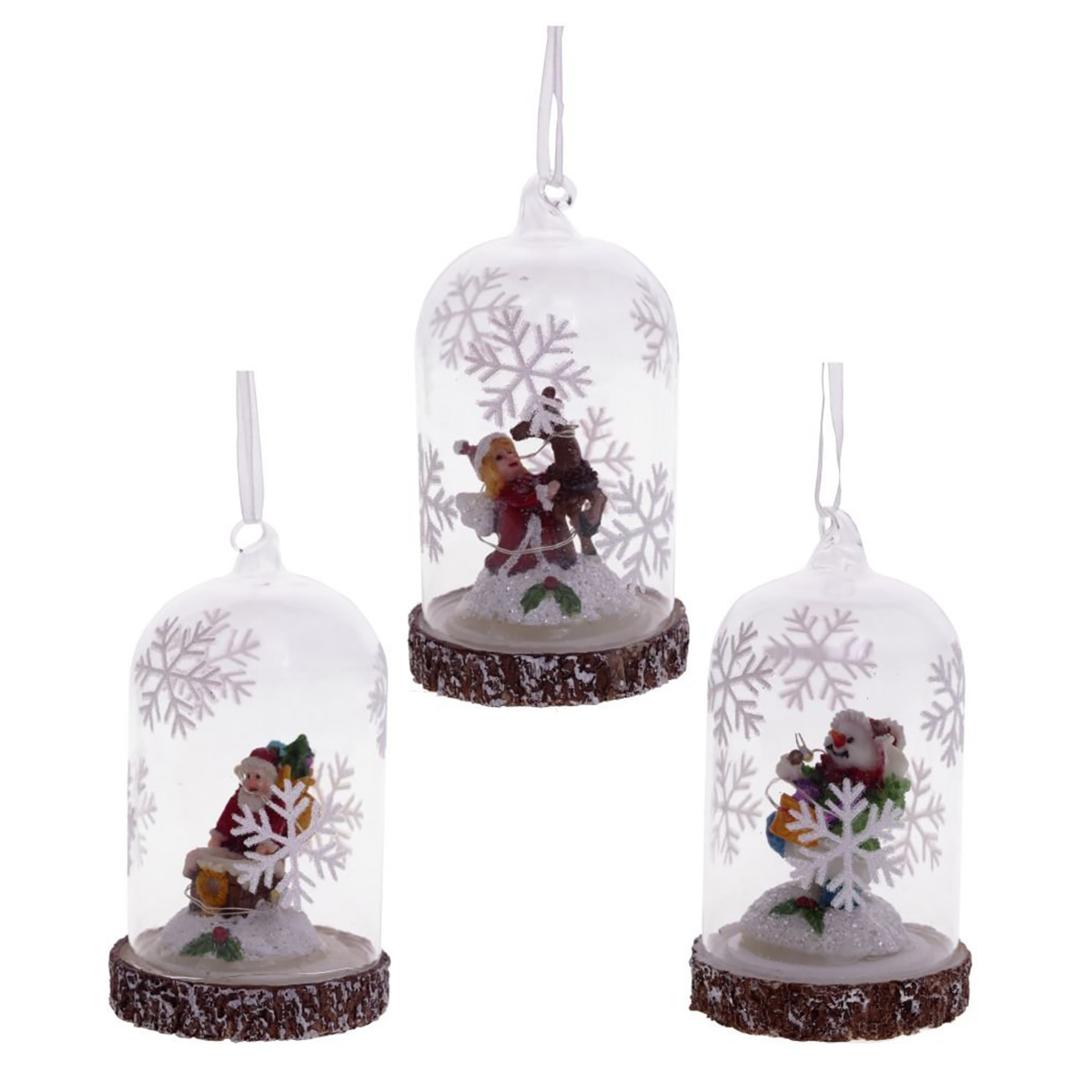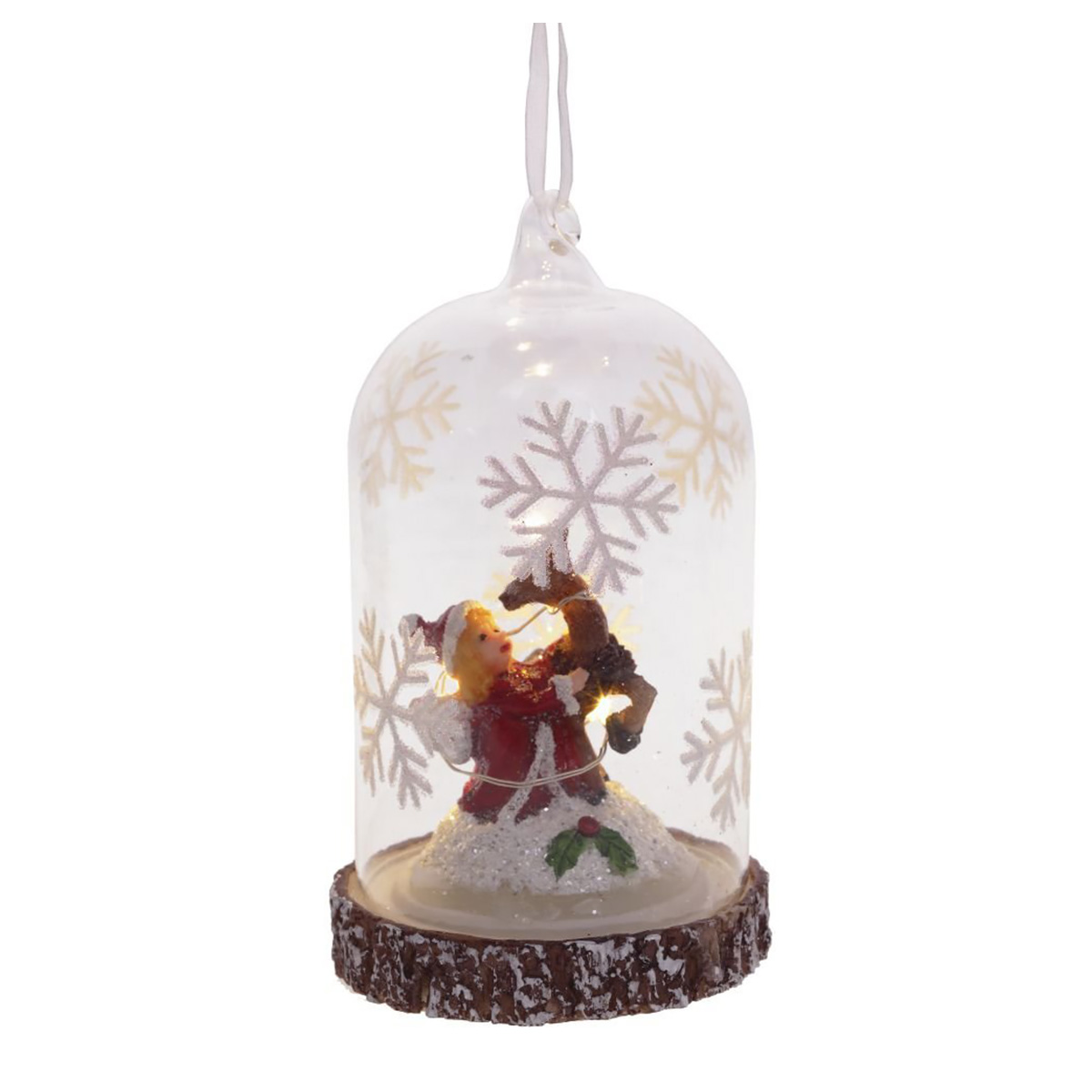 Елочное украшение в виде прозрачного колокола с фигурками новогодних персонажей внутри. Отлично подойдет для декорации вашего дома и новогодней ели. С помощью специальной петельки игрушку можно подвесить. Такое украшение создаст в вашем доме атмосферу праздника, веселья и радости. Представлена в двух вариантах.