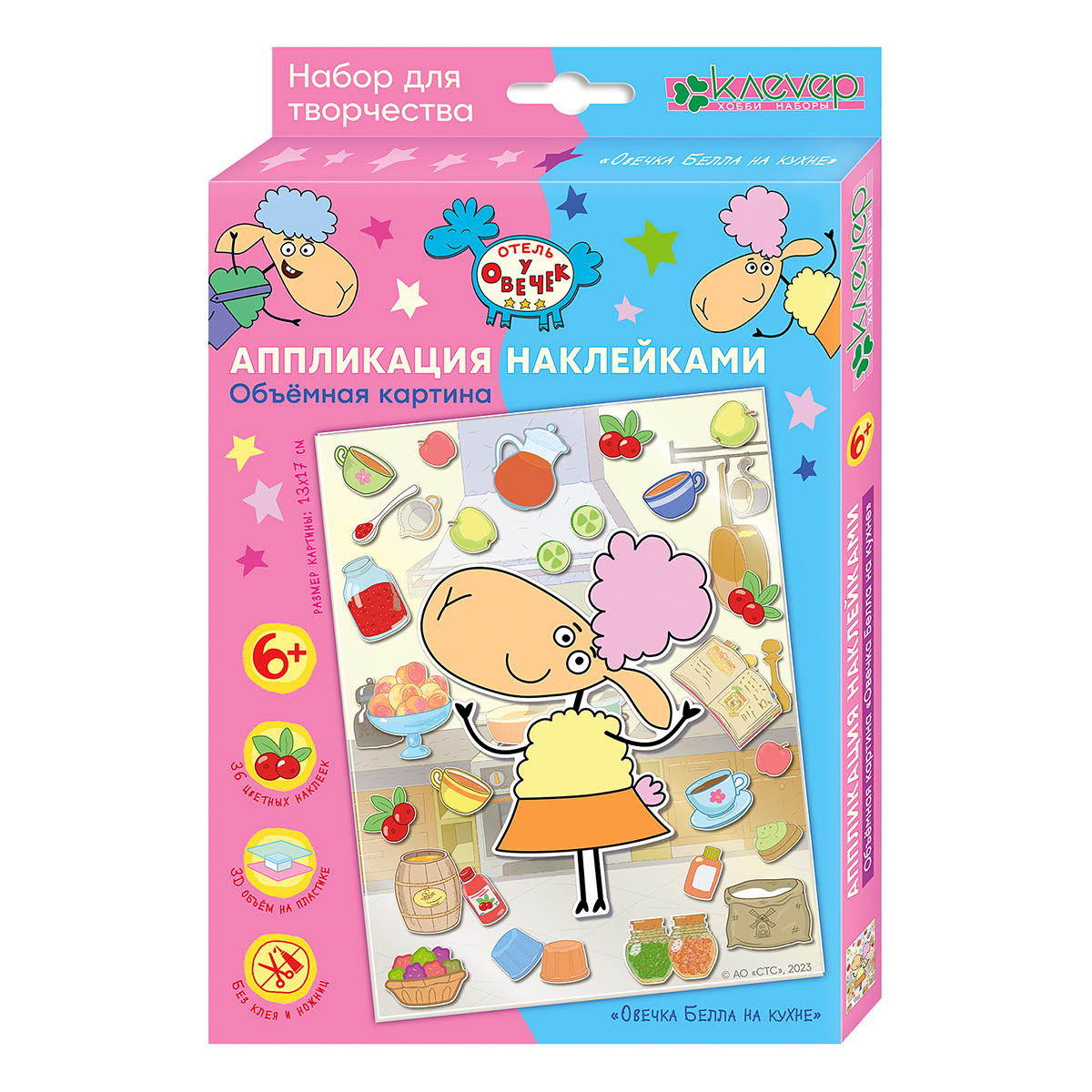 Волшебство техники «Антистресс-декорирование стикерами» вовлекает в творчество детей старше 6 лет. Заполнение наклейками переднего плана картины по своему вкусу развивает воображение и мелкую моторику пальчиков ребёнка, готовя его руку к письму в школе. Объём картине придаёт наклеивание пластика с деталями на расстоянии от заднего плана картины, создавая эффект присутствия вместе с овечкой Беллой на кухне, когда всё "горит в руках". Красочный дизайн, простота работы и радость встречи с любимой героиней мультфильма "Отель у овечек" подарят ребенку отличное настроение!
