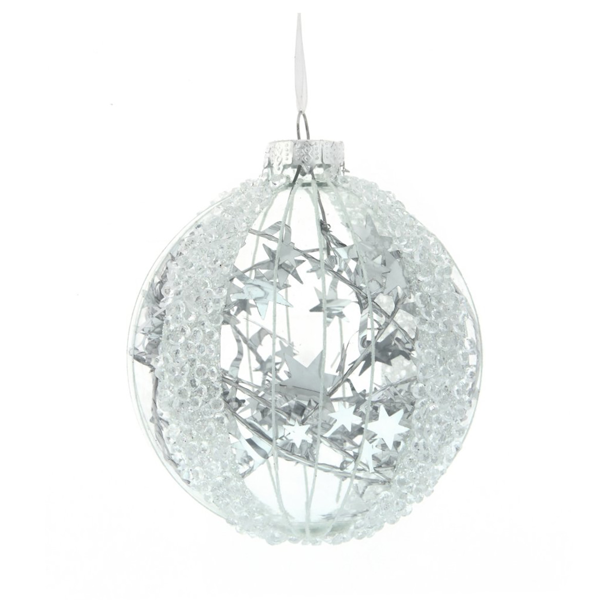Новогодний прозрачный елочный шар украшен бисером снаружи и тонкой гирляндой из серебряных звездочек внутри. Будет чудесно смотреться на хвойных веточках ели.