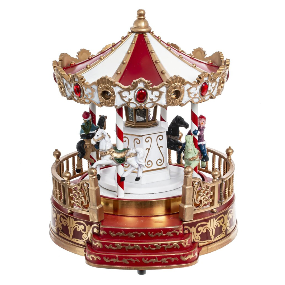 Карусель выполнена в ярких тонах, приковывающих к себе внимание. Резной купол украшен интересным орнаментом, на лошадках сидят веселые дети. Фигурка декоративная с подсветкой и функцией движения "Карусель", изготовлена из полимерных материалов. Работает от трех батареек АА {не прилагаются}.