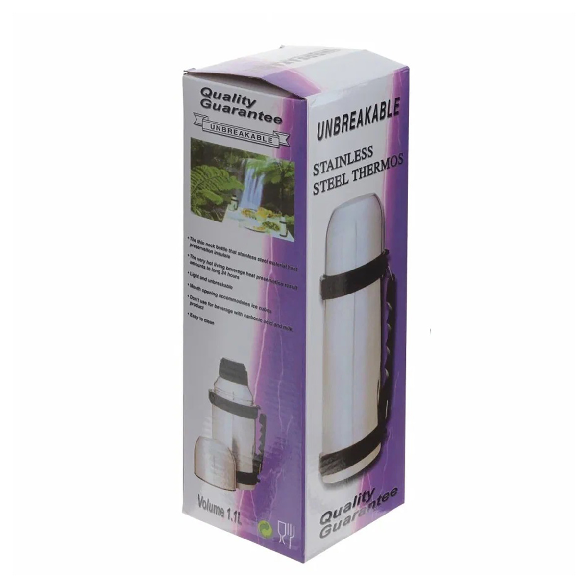 Термос давно уже стал неотъемлемым атрибутом любой поездки или похода, прекрасно подходит для хранения холодных или горячих напитков. Объем 1100 мл. Оснащен прочной винтовой пробкой с кнопкой для наливания, а так же ручкой для переноски. Термос хорошо держит температуру { до 7 часов} и удобен в использовании.