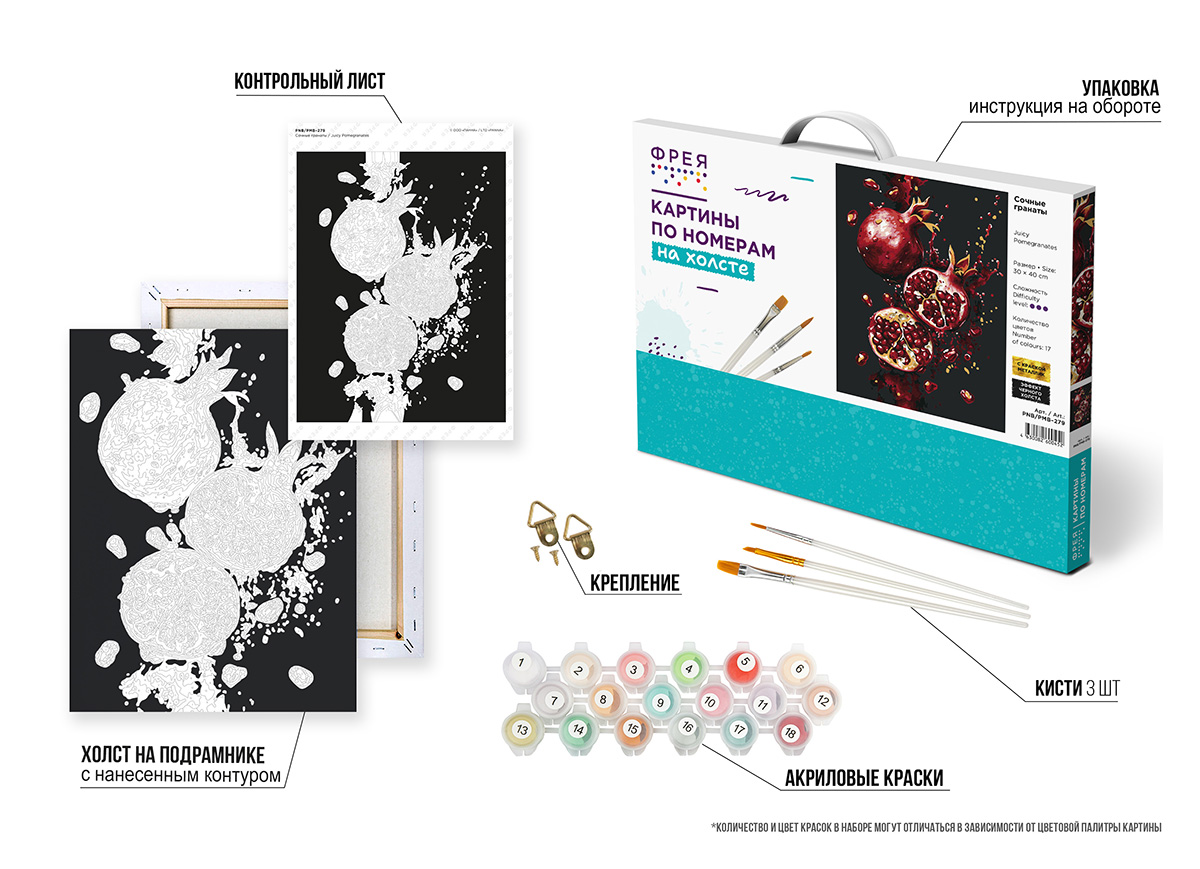 В набор входит: • холст с черным фоном на подрамнике; • акриловые краски и краски металлик в пронумерованных баночках и вакуумной упаковке; • три кисти разного размера; • инструкция с контрольным листом; • специальные крепления для того, чтобы сразу украсить картиной интерьер.