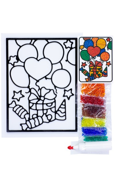 Ребенок с помощью клея и цветных гранул сможет сделать открытку своими руками, а потом с гордостью показать и даже подарить ее своим близким. Основа открытки – белая, рисунок обрисован черными выпуклыми линиями. Между выпуклыми линиями имеются отсеки различной формы. Каждый отсек нужно поочередно обработать клеем ПВА и поместить на него цветные гранулы нужного цвета, руководствуясь инструкцией. Старательно следуя инструкции, ребенок в результате получает изображение, которое может украсить интерьер комнаты или стать оригинальным подарком для родных, близких и друзей.
