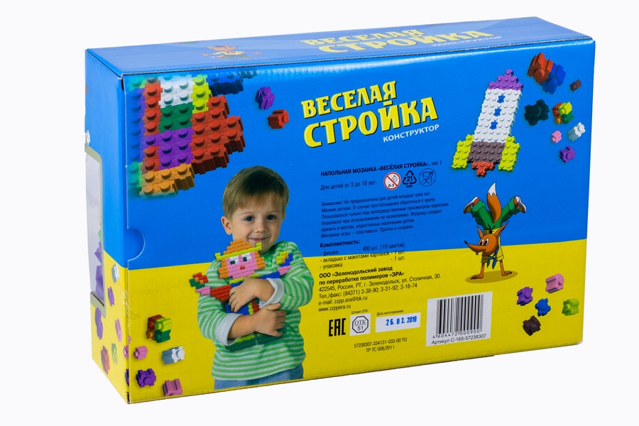 Мозаика «Веселая стройка» - это неограниченные возможности для детей создать предлагаемые фигуры или собственные изобретения и строения из набора разноцветных элементов мозаики. К каждому варианту игры прилагаются картинки с предлагаемыми схемами сборки моделей. Элементы хорошо соединяются между собой с помощью замков, так что собранная фигурка может стать полноценной игрушкой. Игра развивает у ребенка внимание, моторику рук, пространственное воображение, фантазию. Предназначена для детей от 3-х до 10-и лет. Материал игры – пластмасса {полиэтилен}. В наборе 400 фишек, размером 2*2см
