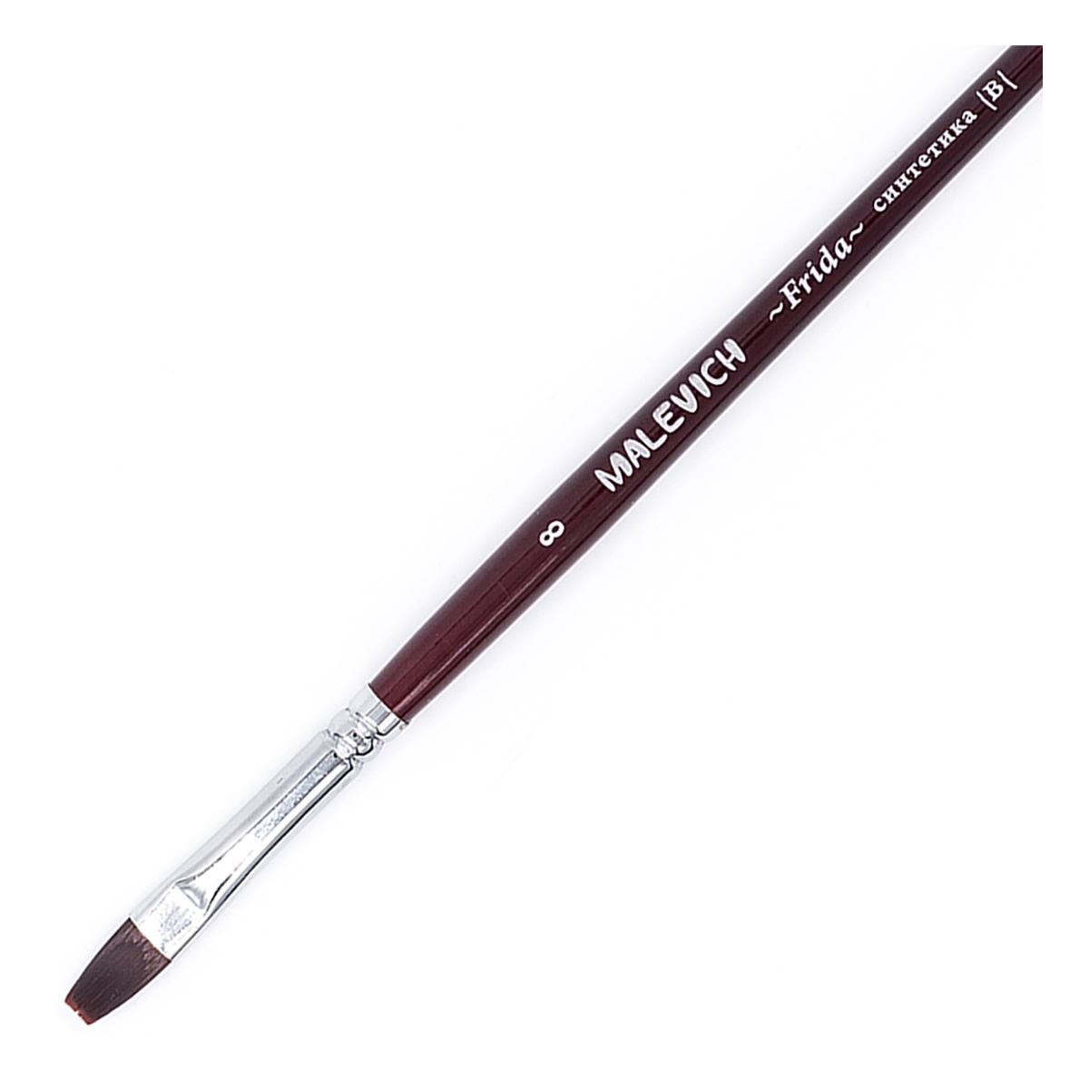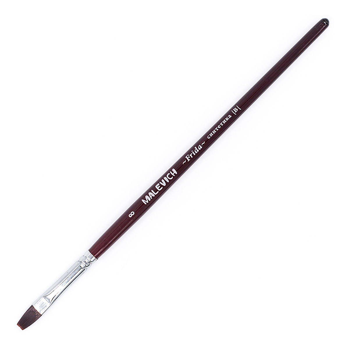 Кисть из синтетики мягкая Frida, плоская №8. Синтетическая нейлоновая кисть Малевичъ Frida с мягким эластичным ворсом. Имеет острый кончик, который долго не стирается. Подходит для акварели и гуаши, хороша для академической техники живописи и лессировок, хорошо держит воду. По свойствам напоминают натуральную белку. Латунная обойма с антикоррозийным покрытием и двойным обжимом. Березовая ручка длиной 18 см покрыта глянцевым темно-красным лаком. Длина ворса {выставка} короткая. Номер кисти соответствует диаметру в мм.