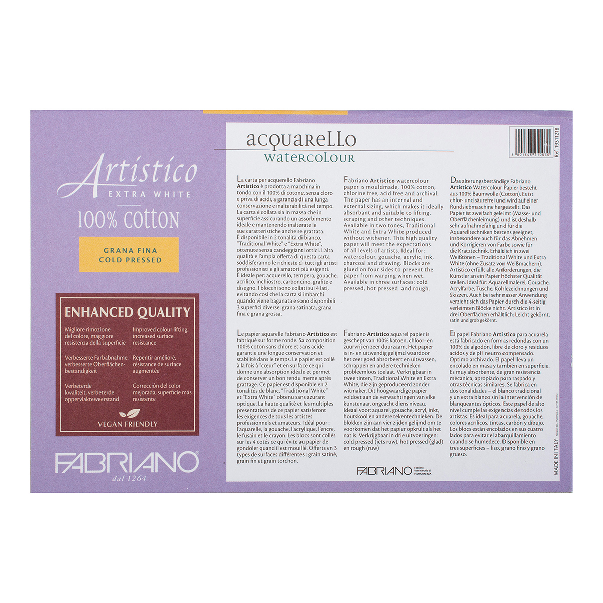 Албом Artistico White от Fabriano выполнен из 100% хлопка предназначен для работ акварелью. Новая формула пропитки бумаги обеспечивает идеальную цветопередачу, пигменты красок не проникают вглубь структуры листа. Пропитка произведена на основе растительного сырья . Производится на мульдовых станках. Технология производства на мульдах придаёт ей уникальные характеристики, свойственные бумаге ручной работы.