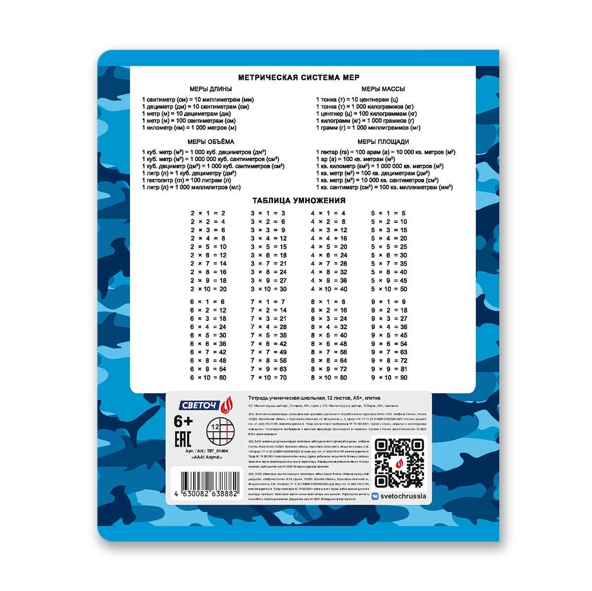 "Светоч" Т87 Тетрадь ученическая школьная, выборочный лак, A5 12 л. на скобе 65 г/кв.м , белизна 100 % клетка 01404 ААА! Акула!
