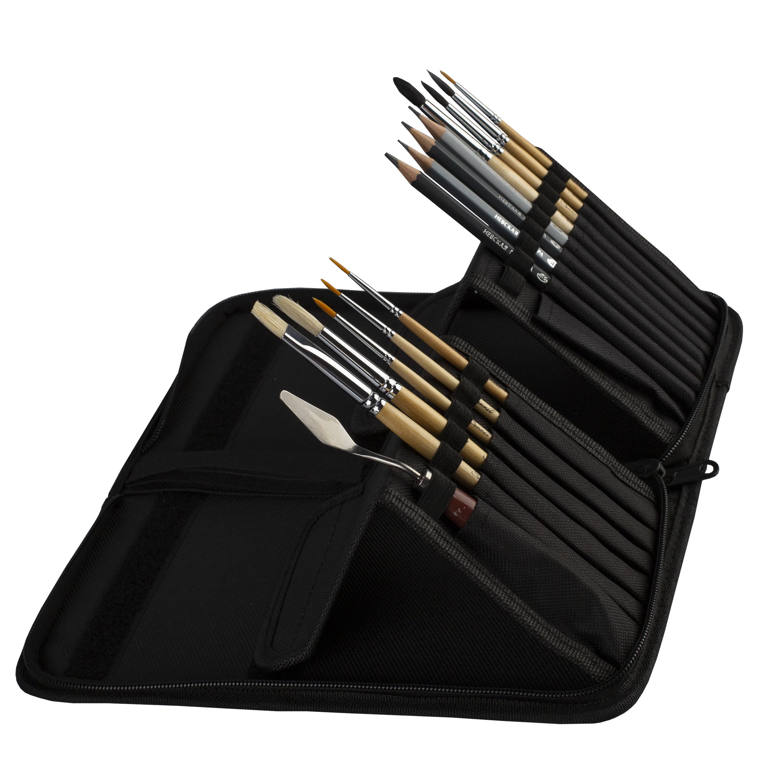 Пенал "Сонет" с 15 отделениями предназанчен для хранения кистей на короткой ручке до 24 см. Выполнен из прочной ткани, надежно закрывается на молнию, может переносится на встроенной петле. Пенал удобен в работе: 2 внутренних отделения складываются в подставки, помогая сделать быстрый выбор кисти. Размеры: - закрытый пенал: 14х27х3,2 см. - открытый пенал: 30х27 см.