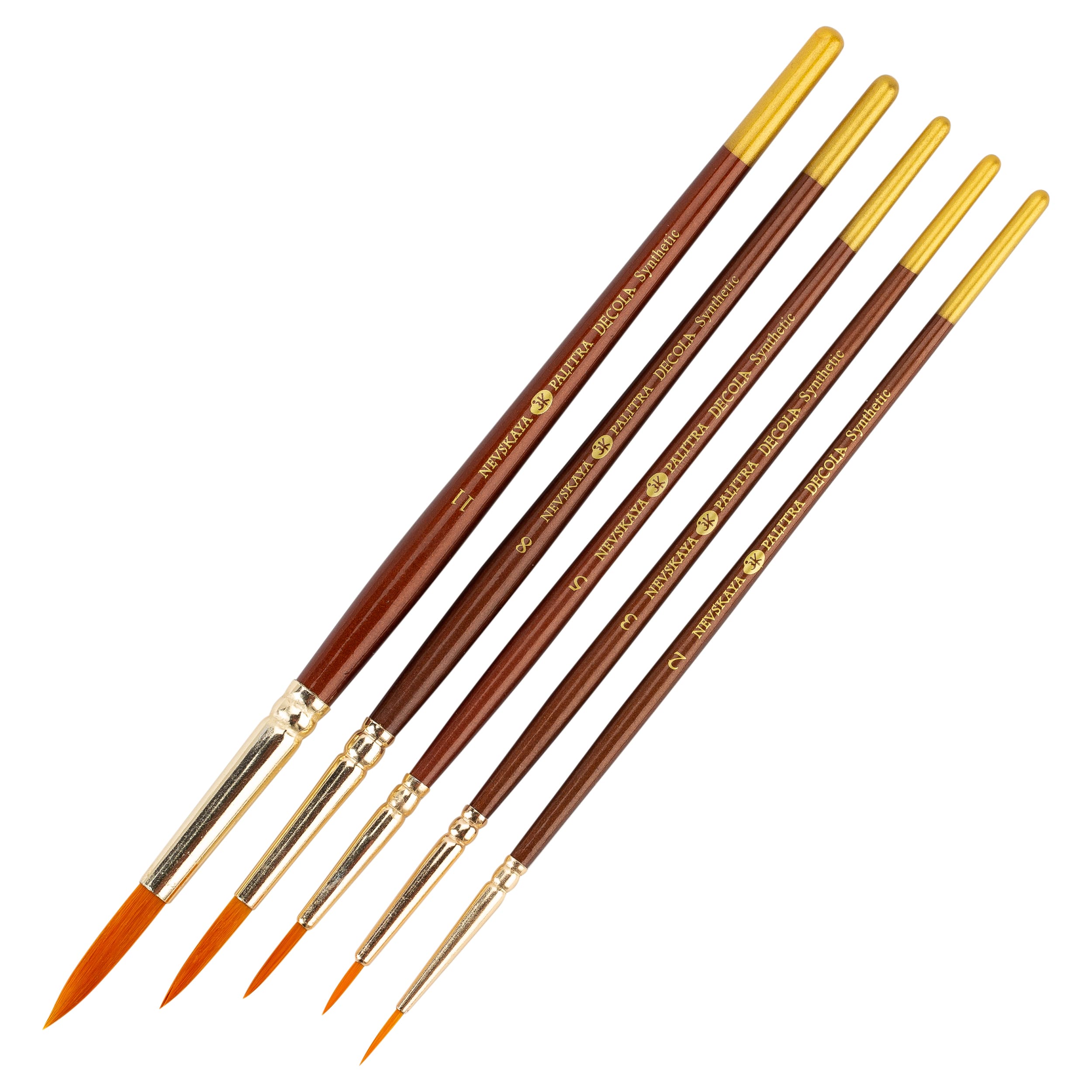 Кисти Decola с синтетическим ворсом идеально подходят для работы с акриловыми красками по любым поверхностям. Круглые кисти наиболее удобны при прорисовке мелких деталей. Состав набора: синтетика круглая, короткая ручка № 0 синтетика круглая, короткая ручка № 3 синтетика круглая, короткая ручка № 5 синтетика круглая, короткая ручка № 7 синтетика круглая, короткая ручка № 9 Кисти из качественной синтетики, средней жесткости, отличаются высокой упругостью и эластичностью, универсальны в использовании – подходят для гуаши, масла и акрила. Средняя жесткость волоса гарантирует бережное отношение к декорируемой поверхности при использовании в хобби техниках, а густой волос позволяет удерживать большое количество краски или лака. В зависимости от размера пучка используются как для прорисовки мелких деталей, так и для выполнения крупных деталей и заполнения фона. Также часто используются в хобби техниках – таких как декупаж, роспись по ткани, батик, роспись по керамике и т.д. Обойма металлическая, хромированная, ручка короткая, пропитана лаком, окрашена цветом «темная медь». Номера 0-3 используются для создания тонких линий и мелких деталей, 4-12 для нанесения фона и больших деталей. Серийно выпускаются: 000, 0,0, 1,2,3,4,5,6,7,8,9,10,11,12.
