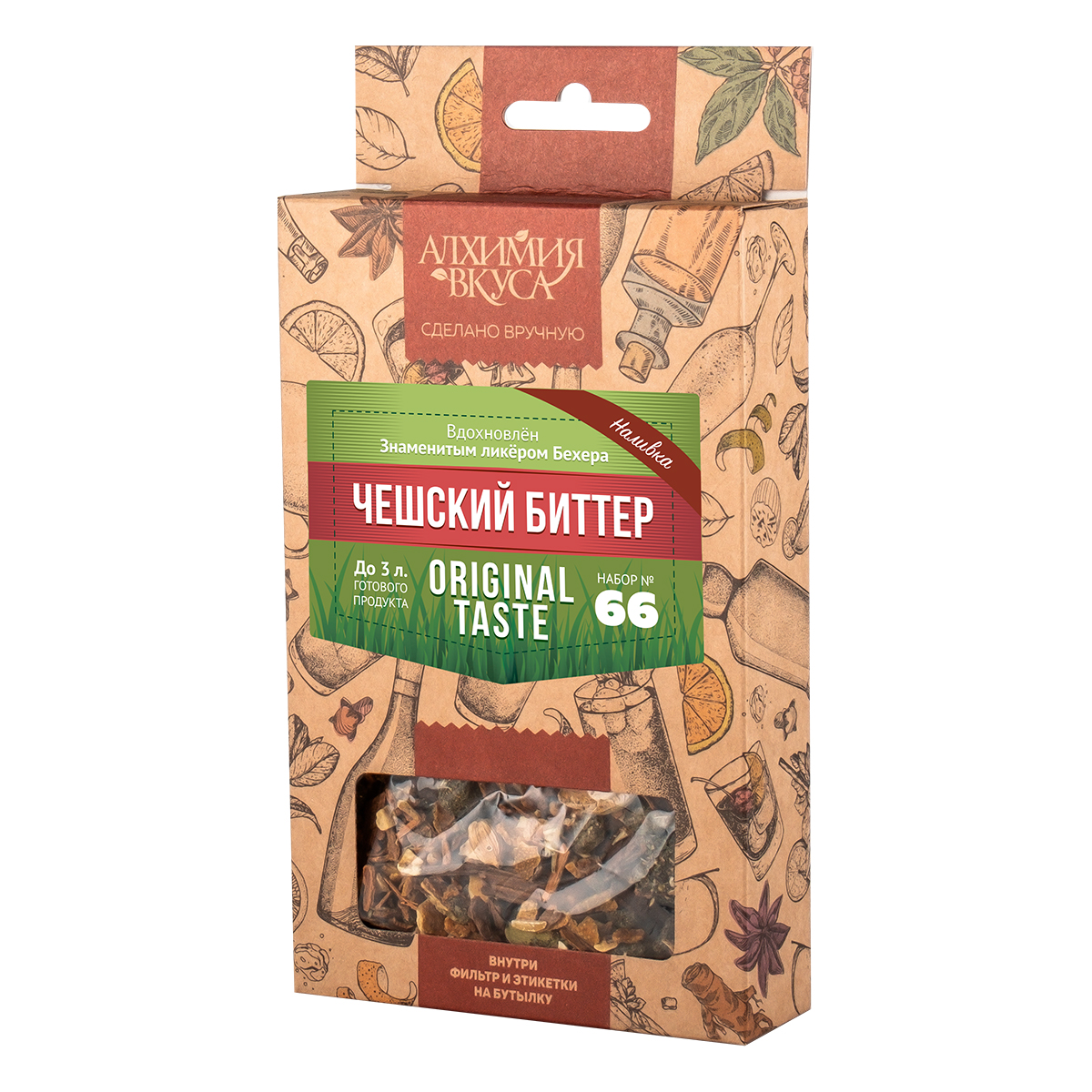 Набор Алхимия вкуса для приготовления наливки «Чешский биттер» включает в себя тщательно отобранные травы и специи, которые были смешены в определенных пропорциях, чтобы соответствовать оригинальному рецепту богатого и глубокого чешского биттера. Состав: корица дробленная, цедра апельсина, цедра лимона, можжевеловая ягода, кориандр , бадьян, гвоздика целая, кардамон , перец душистый горошек, анис семя, мелисса дикая, чипсы из российского дуба , корень солодки.